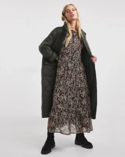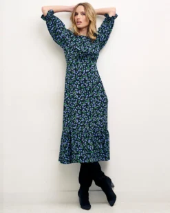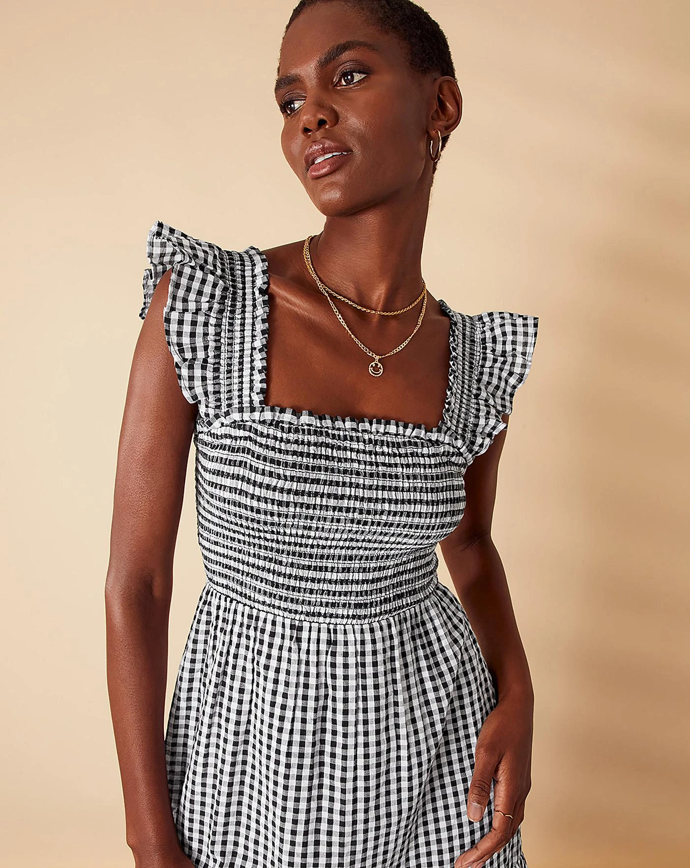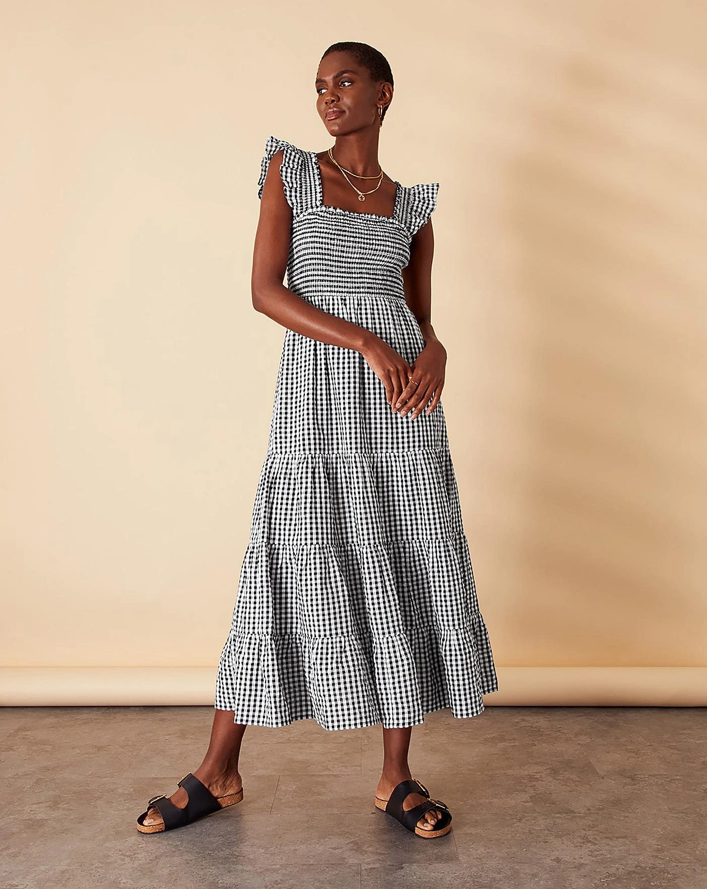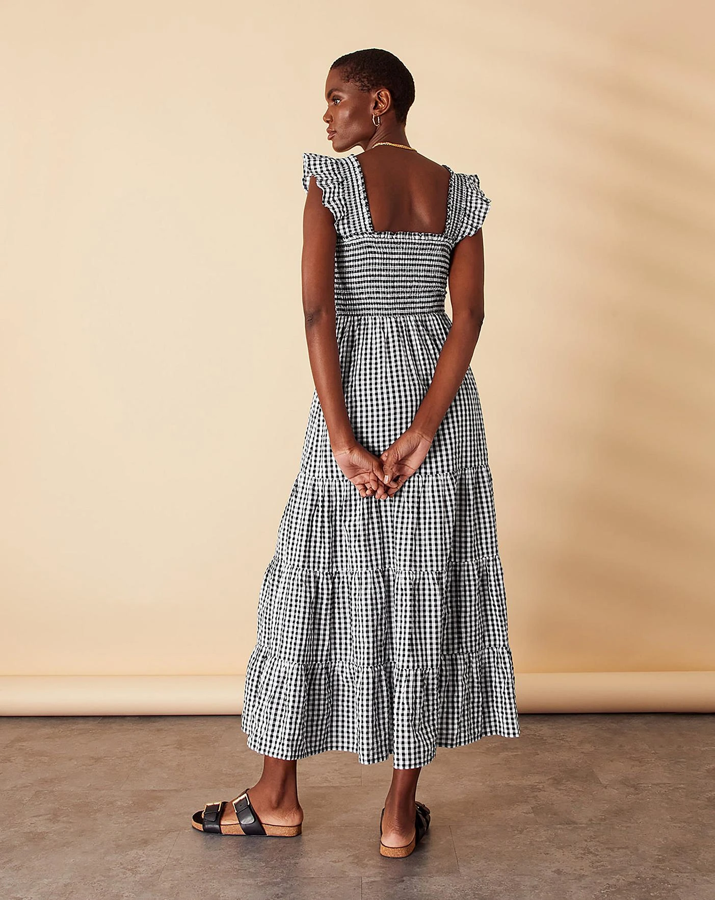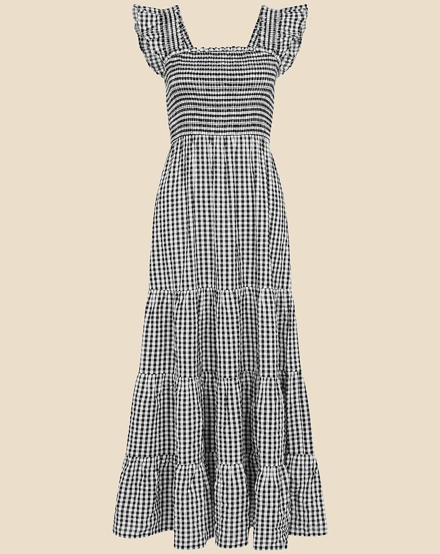 - An effortless option for summer mornings, this dress combines monochrome gingham with a feminine tiered dress. The shirred bodice stretches to fit comfortably around your bust, with a square neck and flutter sleeves to finish.