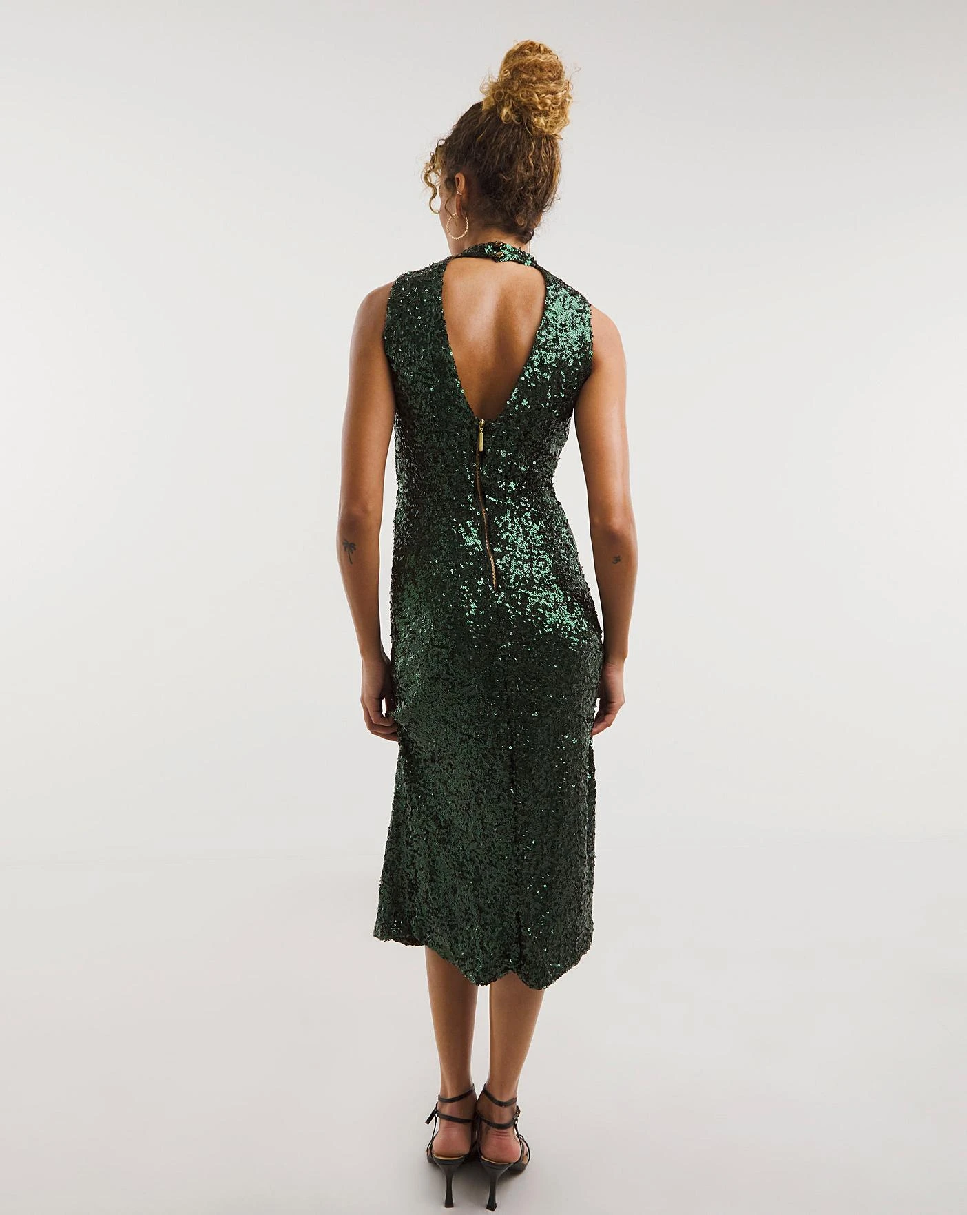 For those events that you want to make more of an impact! This stunning sparlking sequin midi dress is just the thing. With its high neck, Vback and side split.