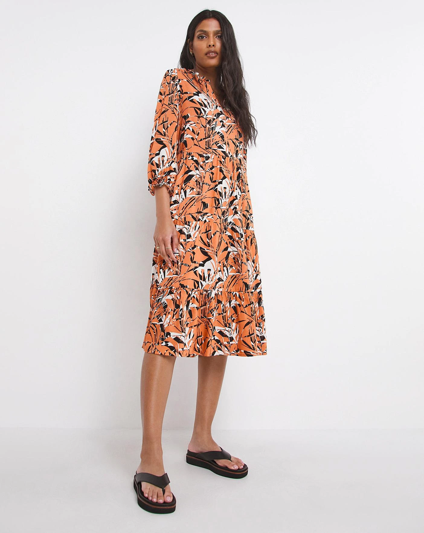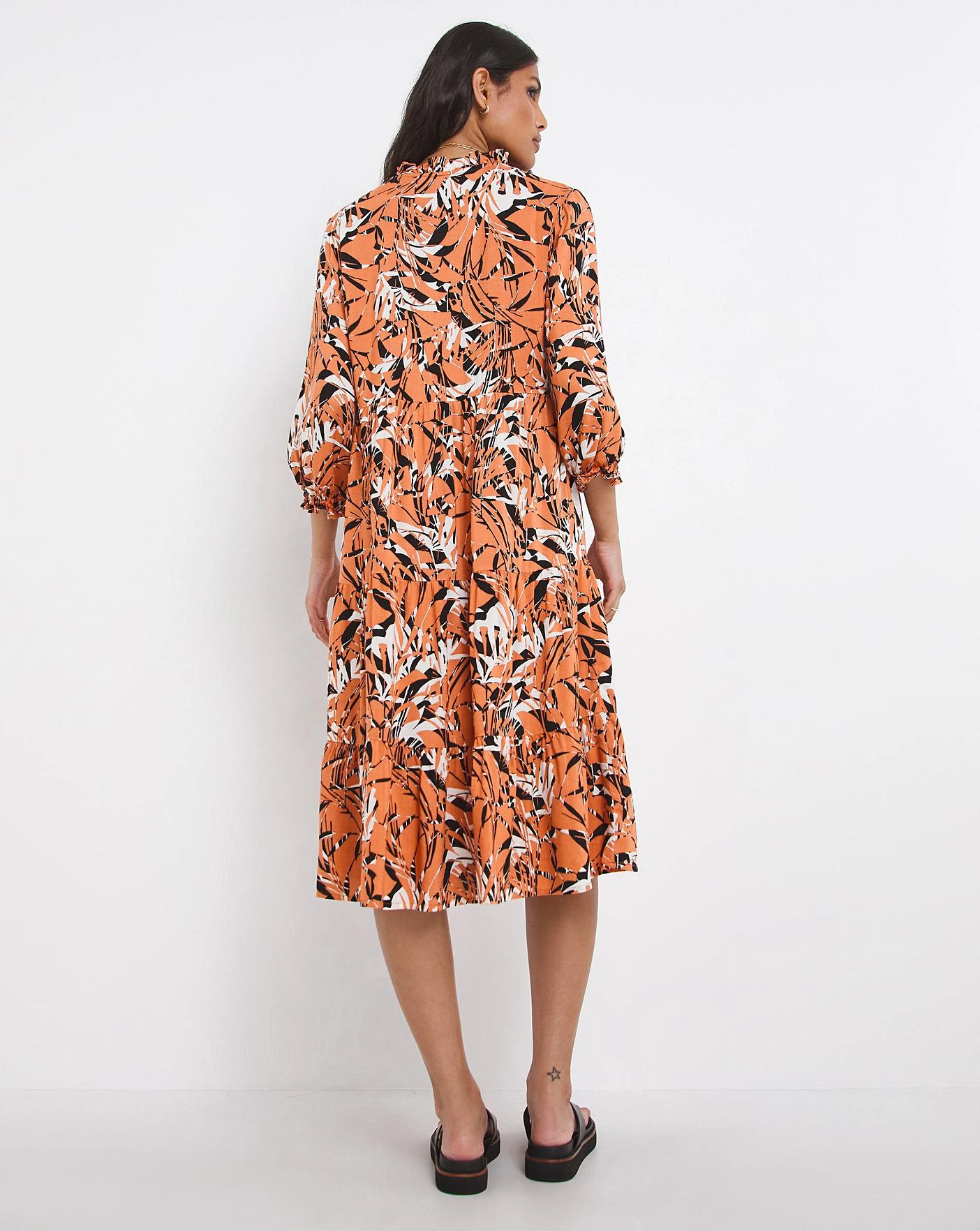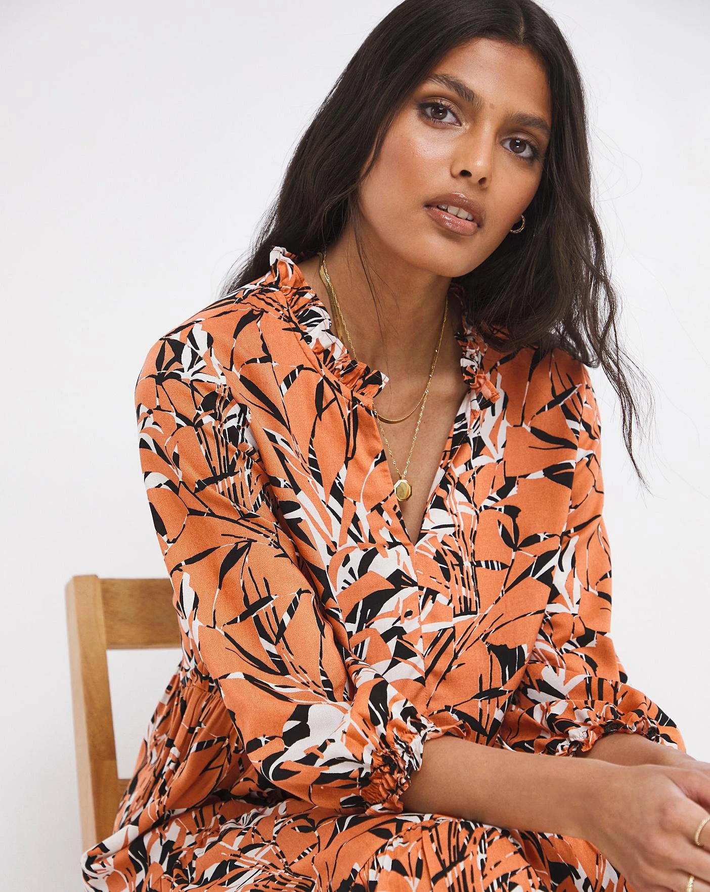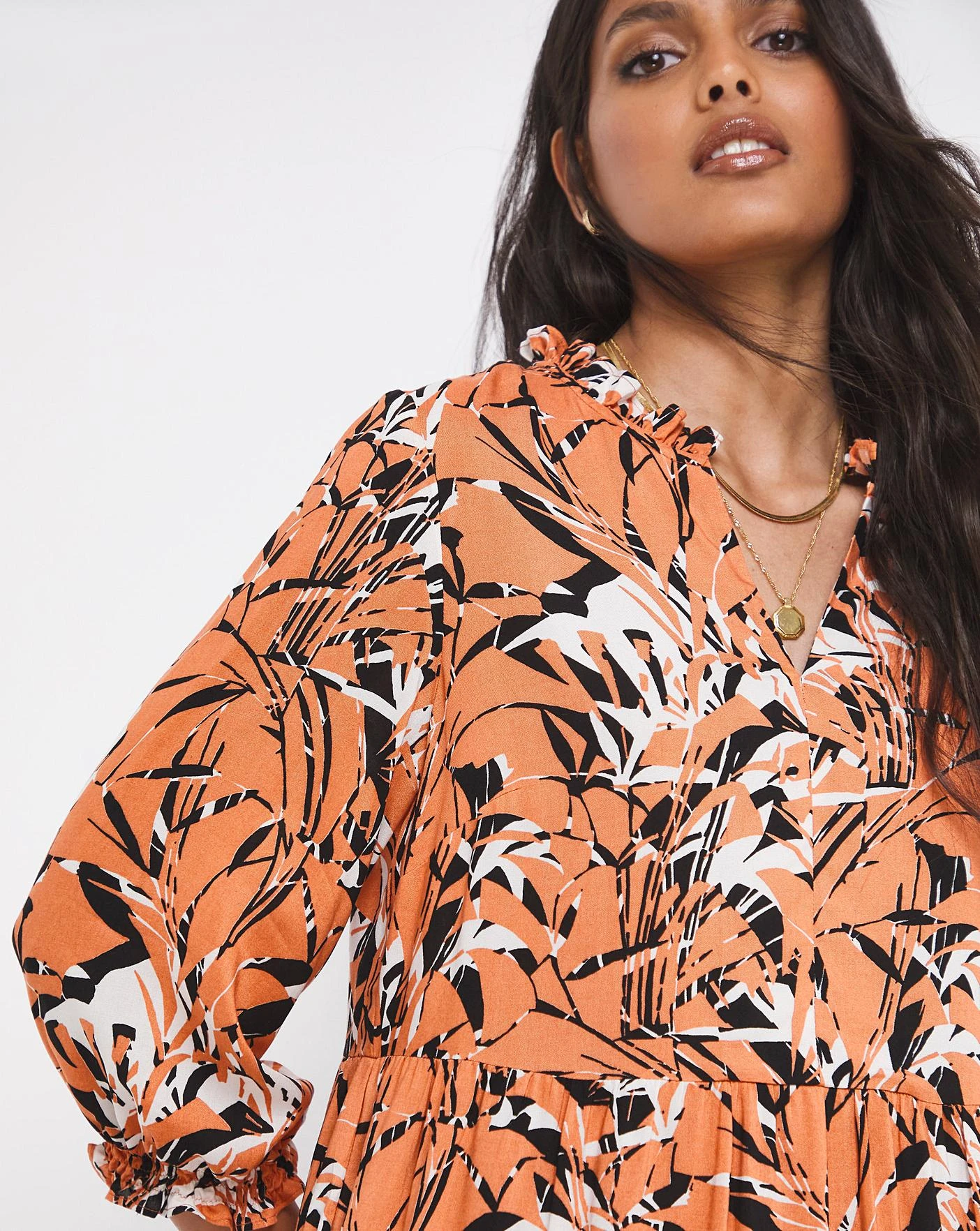 In the same super soft viscose fabrication, our best-selling balloon sleeve smock dress has had a summer revamp. In a new short shape, this dress features 3/4 sleeves with elasticated frill cuffs and a v-neck with a subtle frill collar. In a baked coral print, pair with chunky black sandals to complete your look.