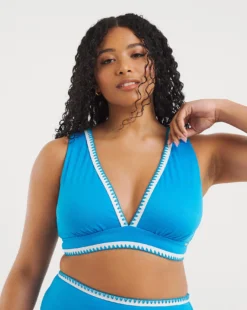 Fusing vivid blues with cool crochet trims, the Figleaves Frida Soft Plunge Bikini Top is guaranteed to liven up the beach. Perfect for your next sunshine adventure, this bikini top features supportive straps with a thicker high apex detailing. Non wired but removable pads included.