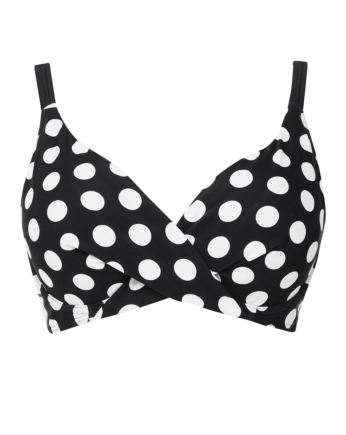 With a soft centre front, creating a deep V neck, this Figleaves Tailor Underwired Non Pad Wrap Plunge bikini top flatters your shape. This soft shaping contrasts with the sharp monochrome polka dots to create a stylish contemporary look.