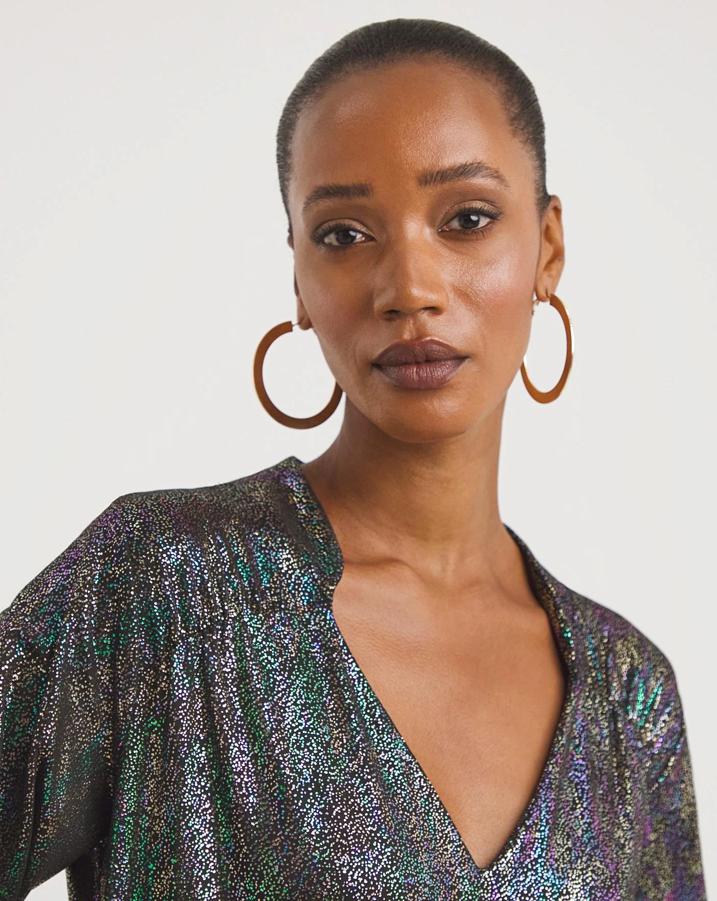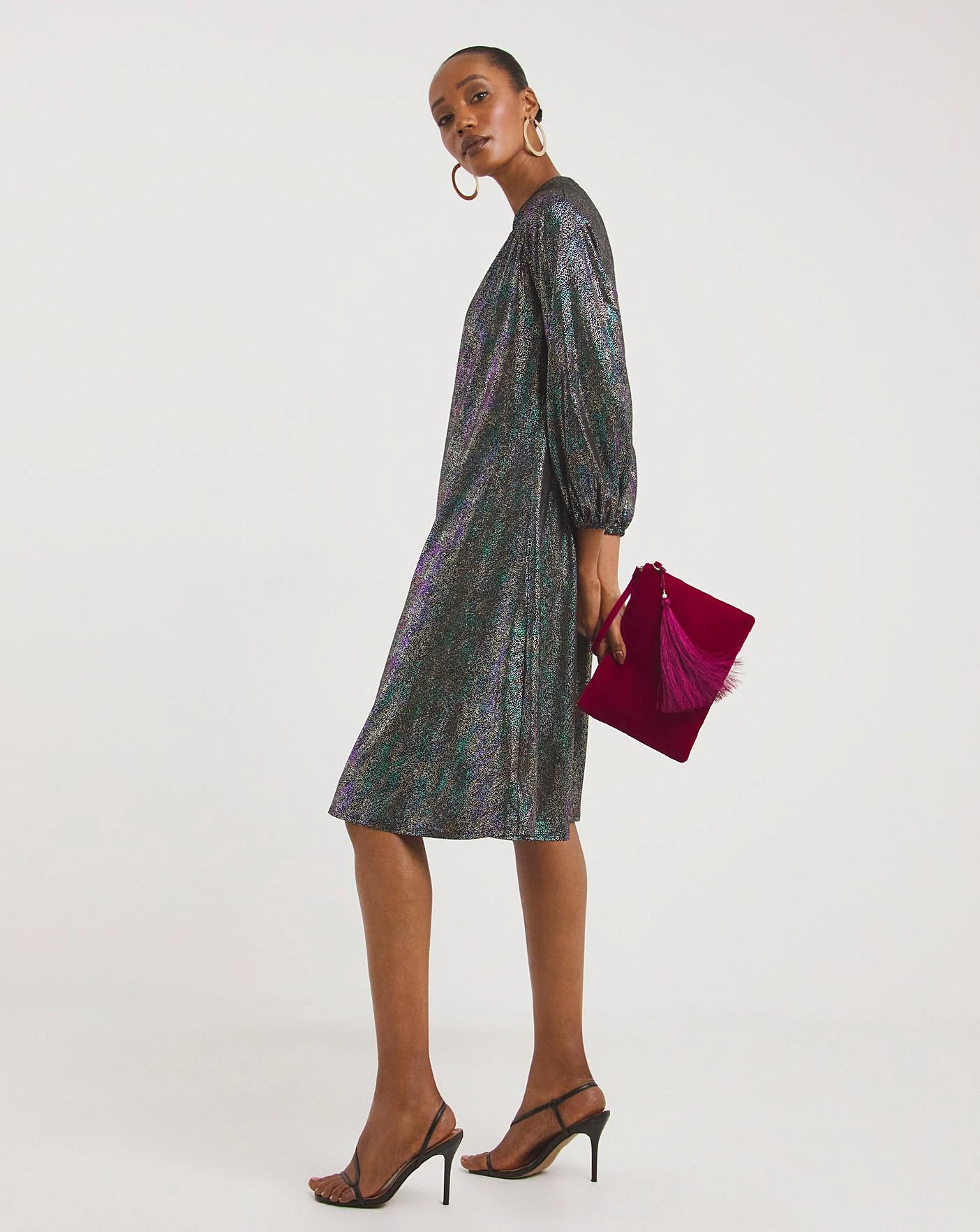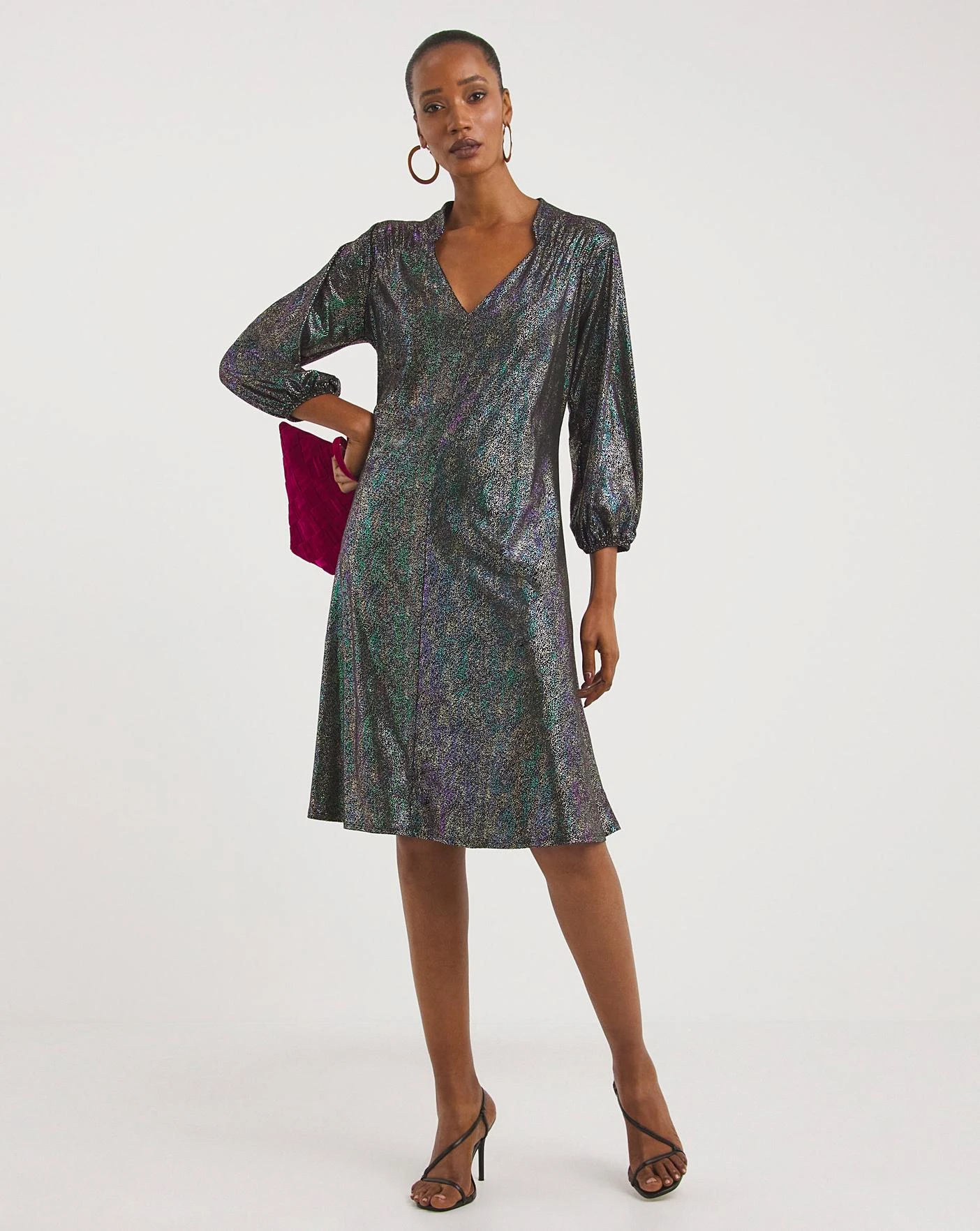 Jazz up your day-to-day dresses with this subtle foil print swing dress, designed in a soft material with elasticated 3/4 sleeves and a V-neckline. Perfect for any occasion, day or night.