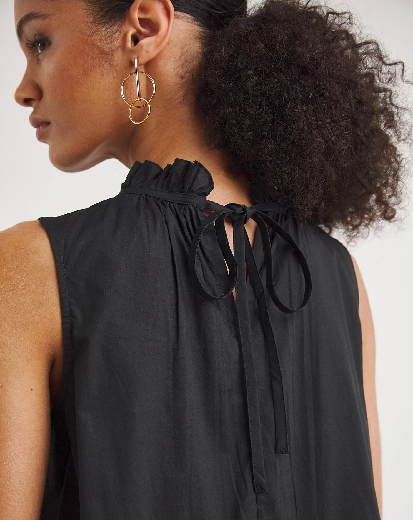 Although mini in length our Rhodes Sustainable Poplin Sleeveless Tiered Mini Dress ismax on volume. A tiered body means this dress does not hold back and we adore its relaxed fit however we also love to switch it up and create a more fit and flare silhouette by adding the self-tie belt with a bow to add a feminine flair which compliments the high necklline formed by a flourish of romantic frills.
