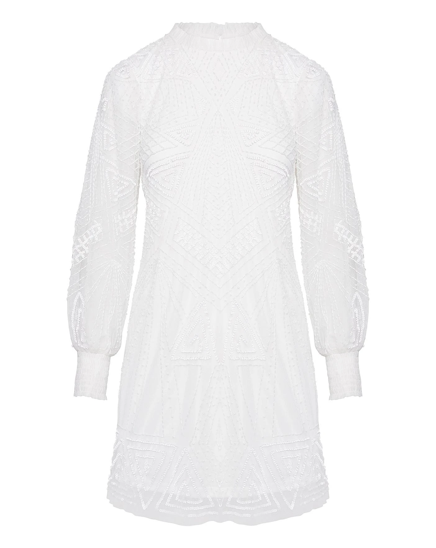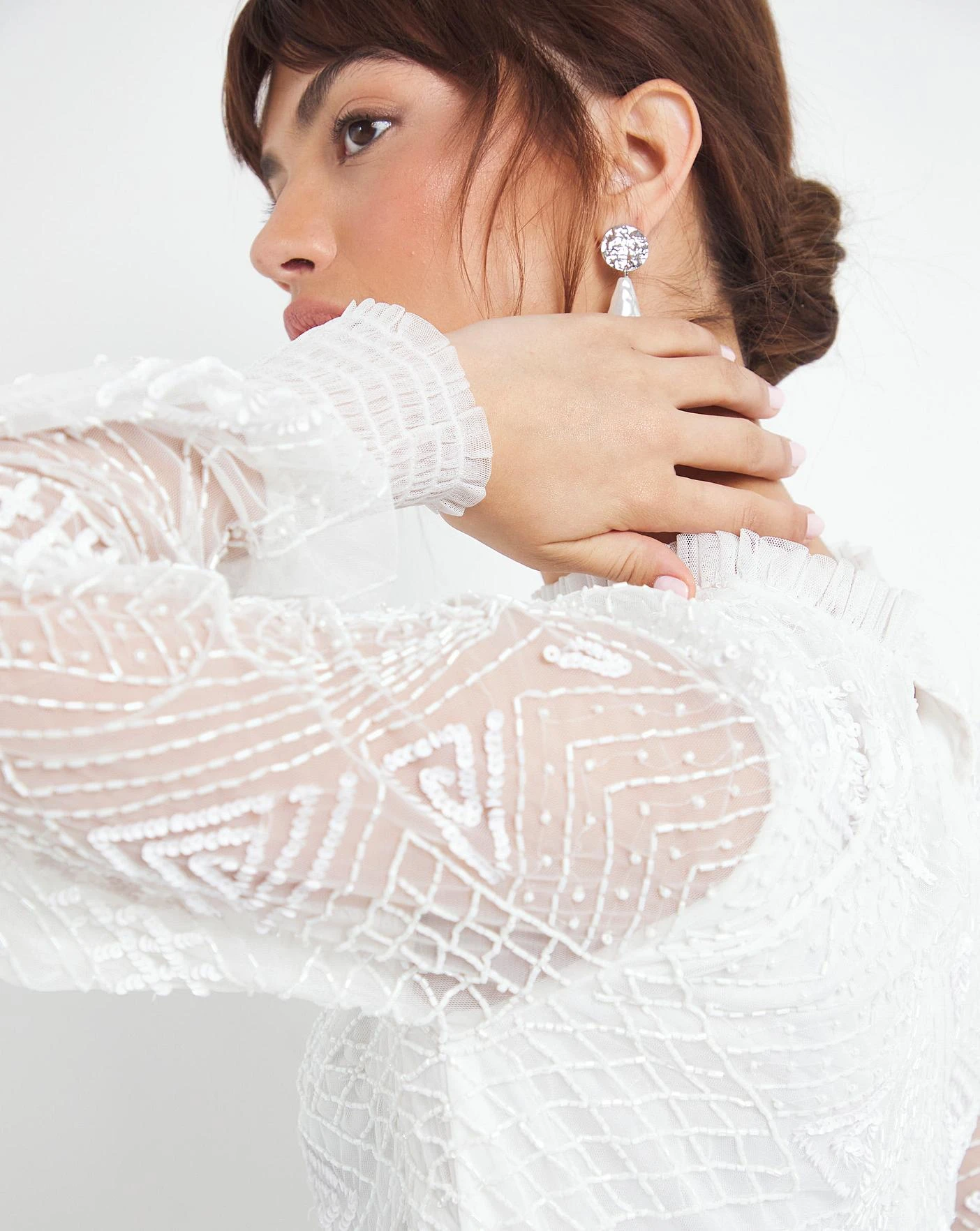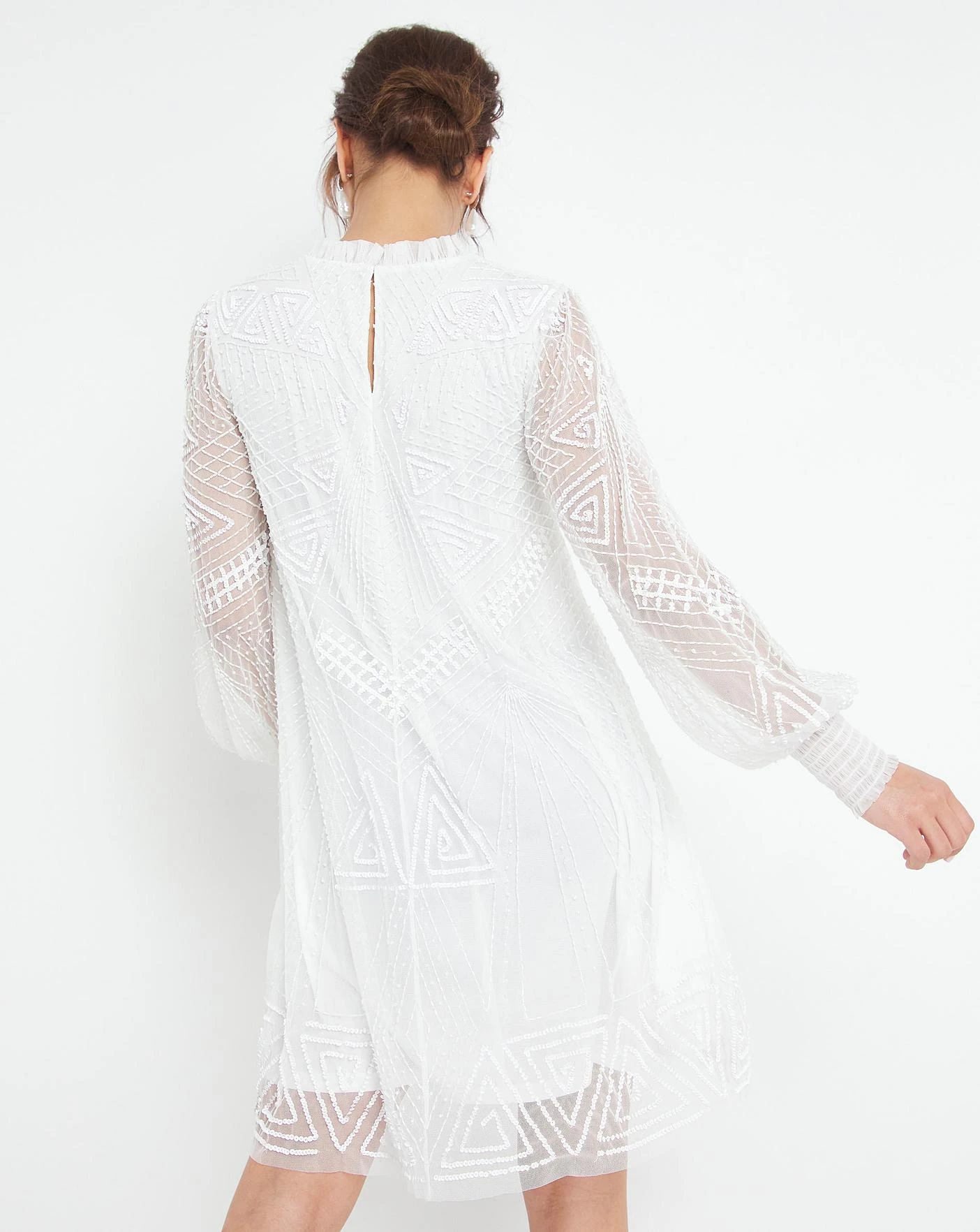 Turn heads in our Joanna Hope beaded dress, featuring mesh detailing and smocked cuffs. Dress comes body lined and fastens at the back with a keyhole, hook and eye.