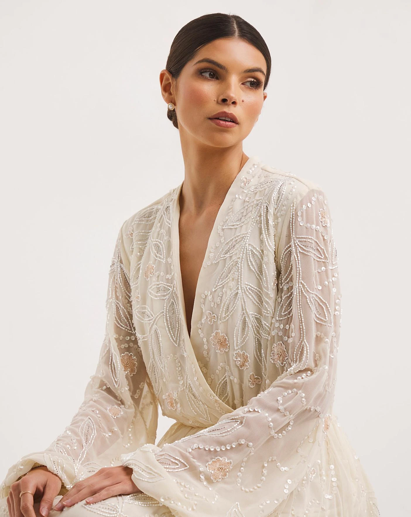 Exclusive to us – Joanna Hope. Our Emma embellished bridal dress is an elegant style for the modern bride who dares to be different. The dress features floral sequin and bead embellishment on to a beautiful sheer georgette, which gives a vintage feel in a shade of antique cream. Cut to a shorter midi length with a slightly flared skirt this is a truly flattering piece. Bodice features a faux wrap and comes lined, fastening at the back with a concealed zip, button and rouleau. The perfect dress to say I do in.