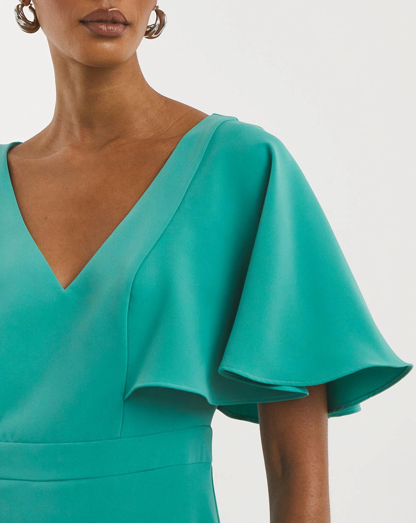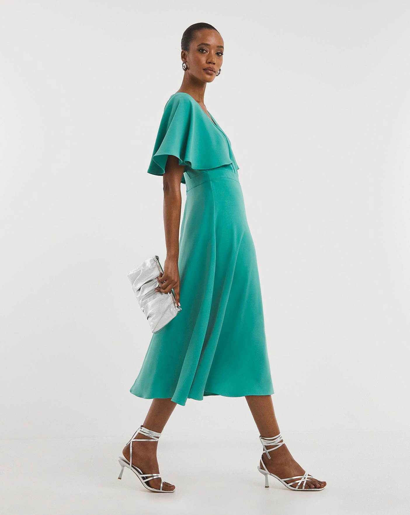 In an elegant midi length, this timeless Joanna Hope angel sleeve wrap dress is simply stunning. It features with pretty angel sleeves, a concealed back zip with a keyhole closure, and a modest v-neckline with seam detailing. A truly beautiful dress.