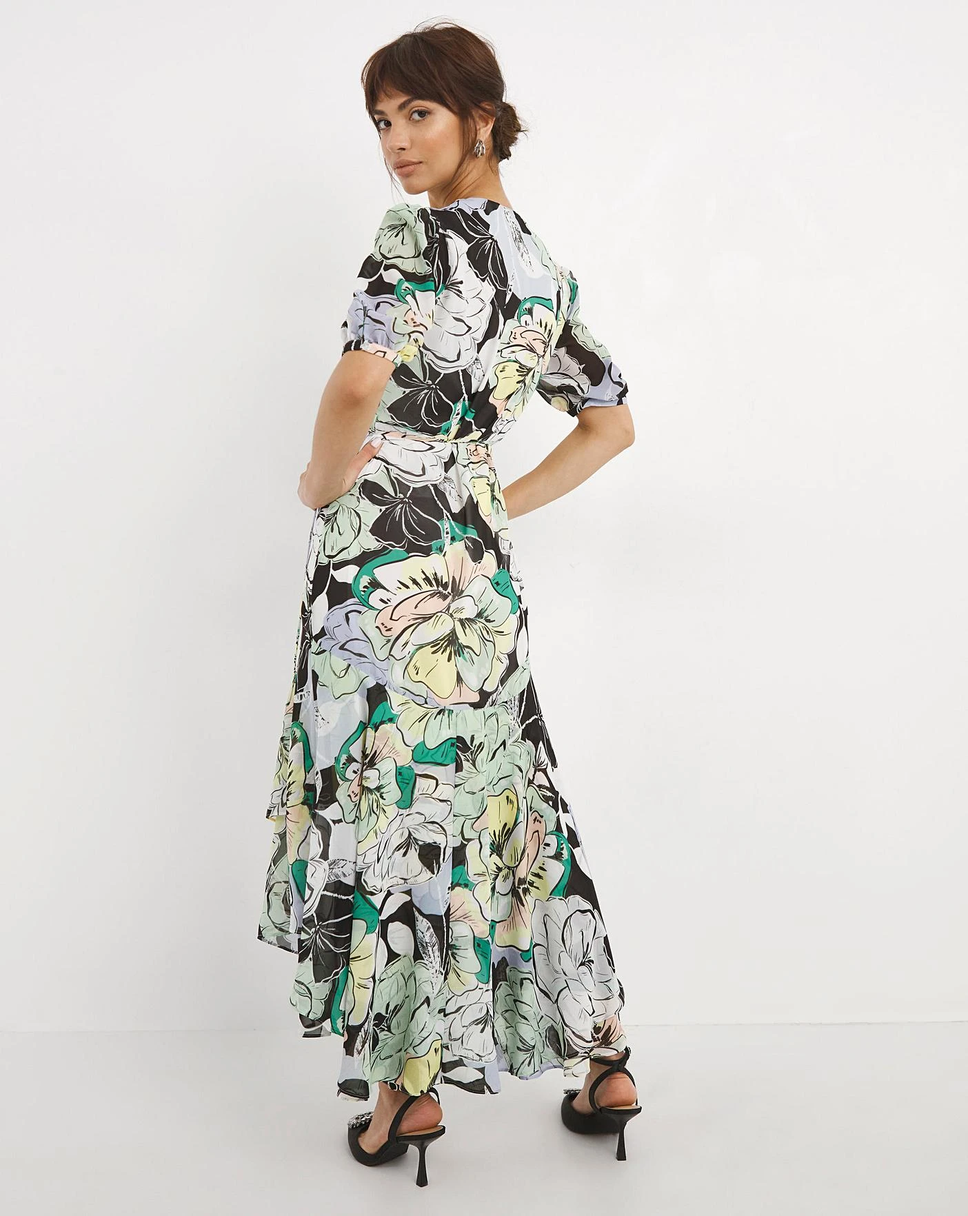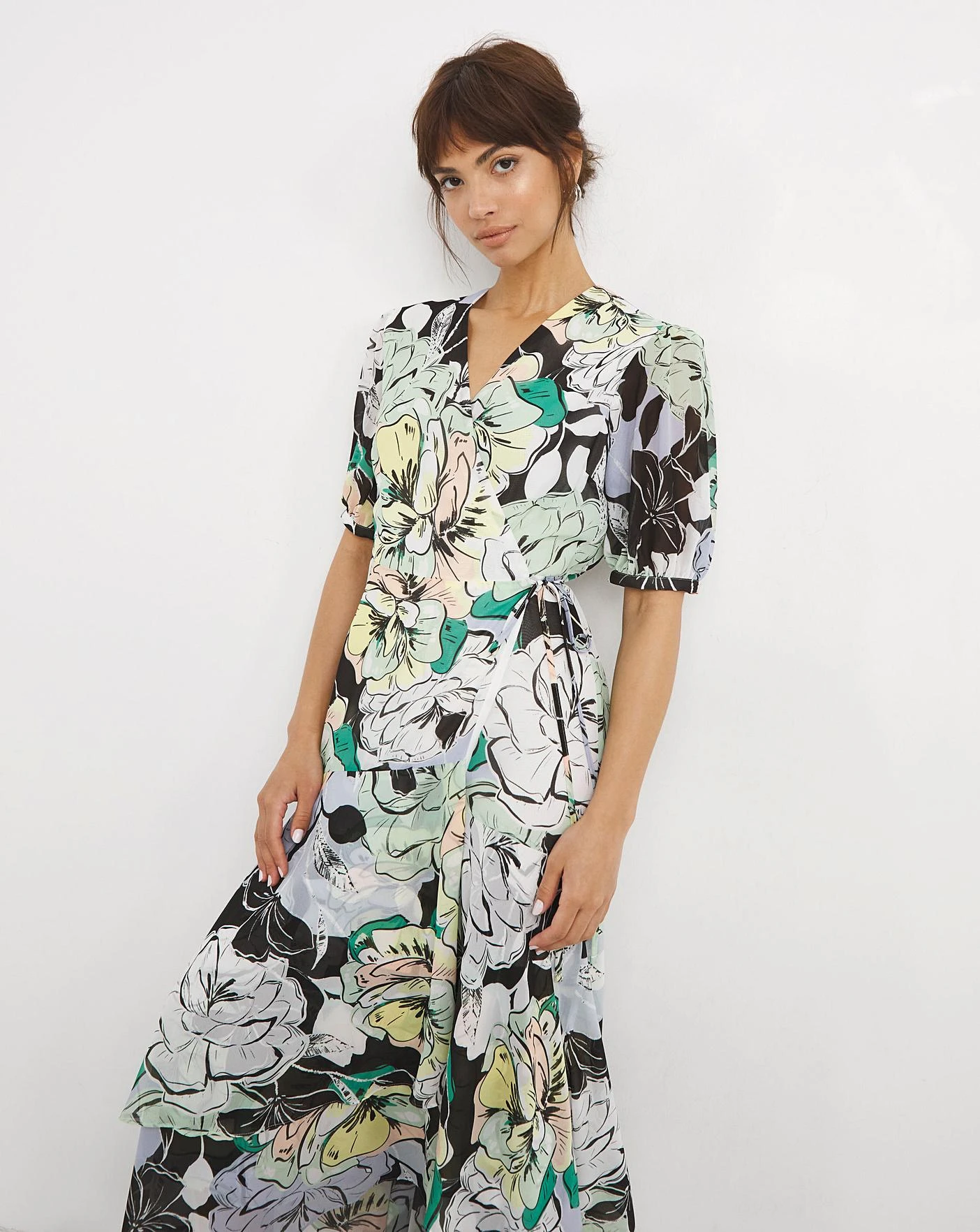 This Joanna Hope functional wrap dress comes in a fabulous unique print. The dress features self fabric ties, functional button cuffs and a gathered sleeve detail. Dress comes body lined.