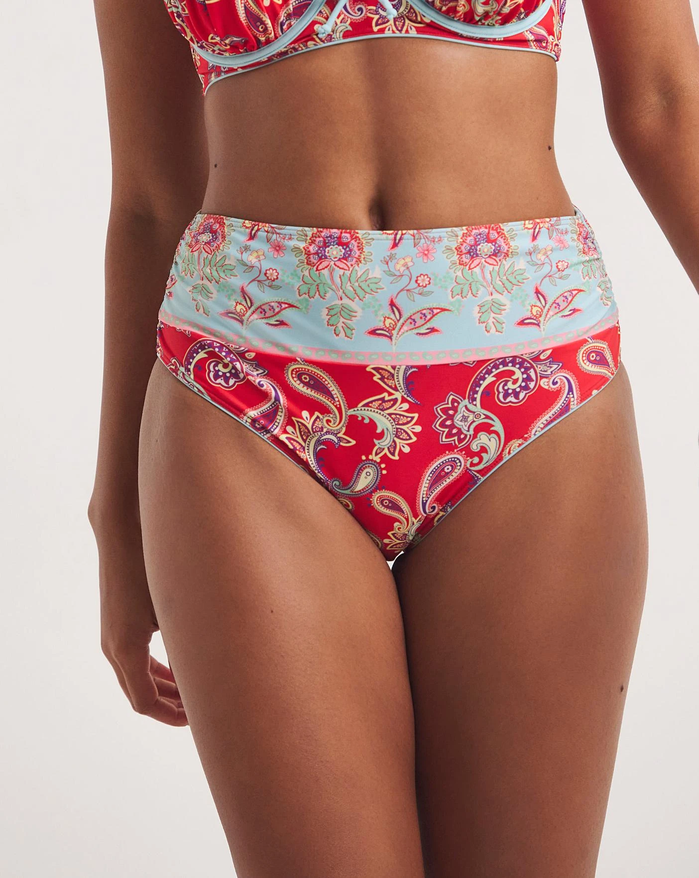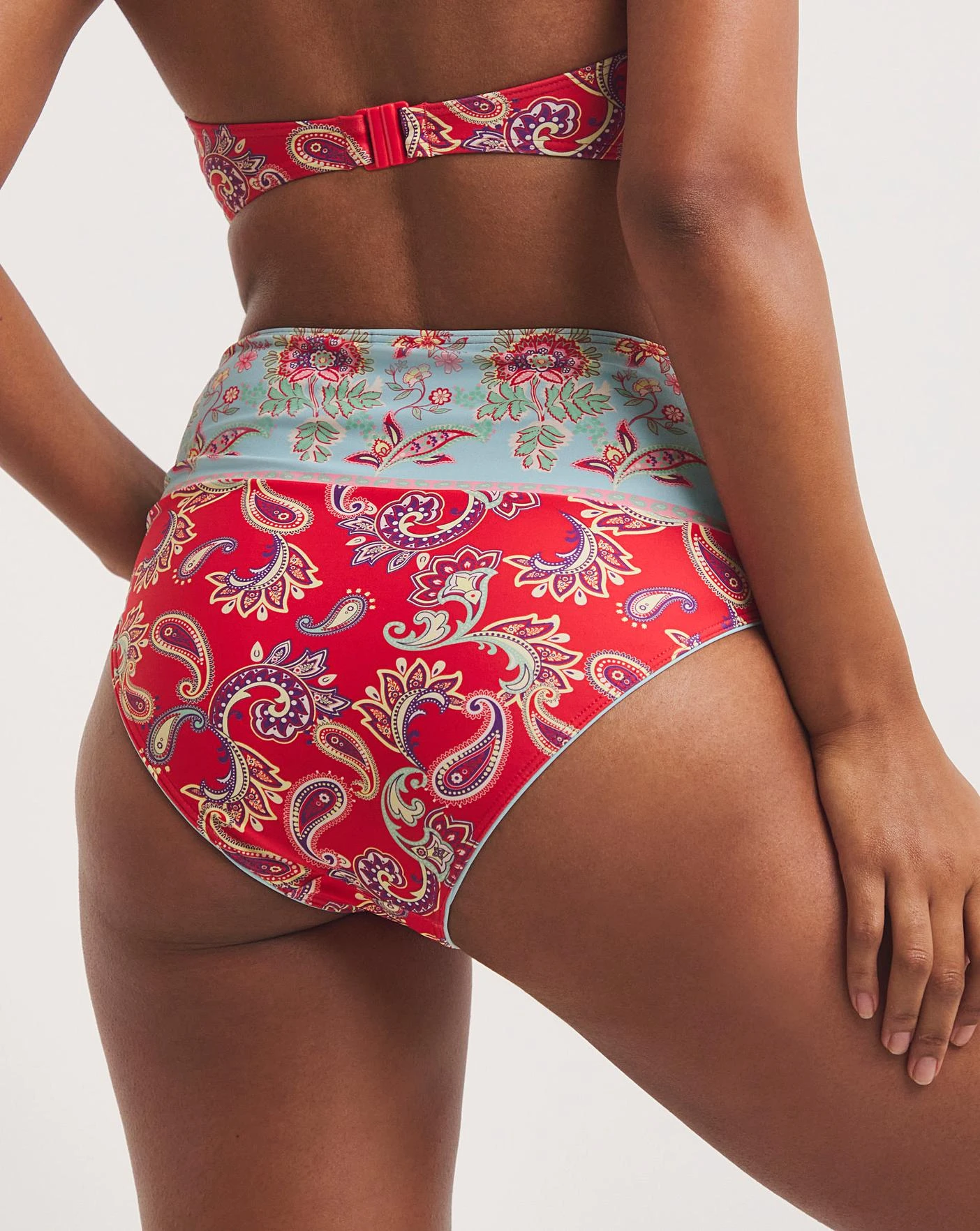 Get poolside ready with our Boho inspired Swimwear from Joe Browns. This high waisted bikini brief comes in a gorgeous red paisley print contrasted with a blue floral print border. Features side ruching for a flattering fit. For the complete look pair with the matching bikini top or matching tankini top.