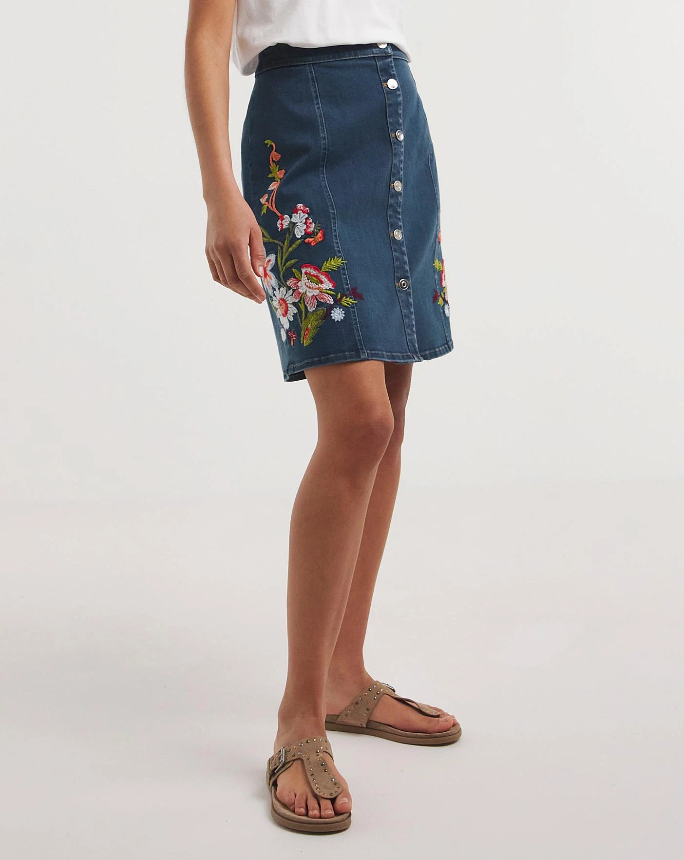 Step into summer with our pretty, women’s denim A-line skirt, especially one that oozes a Joe Browns twist. With added delicate floral embroidery to give it those seasonal vibes and topped off with button detailing for the perfect finishing touch. Feminine and flattering, just pair it with a beautiful blouse and you’ll be turning heads all day long.