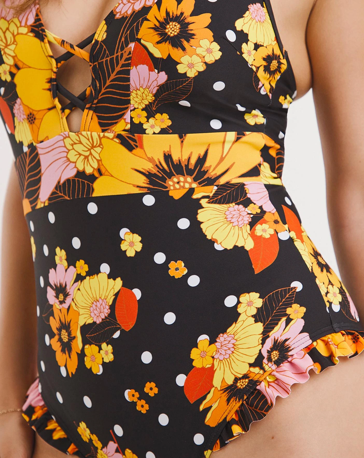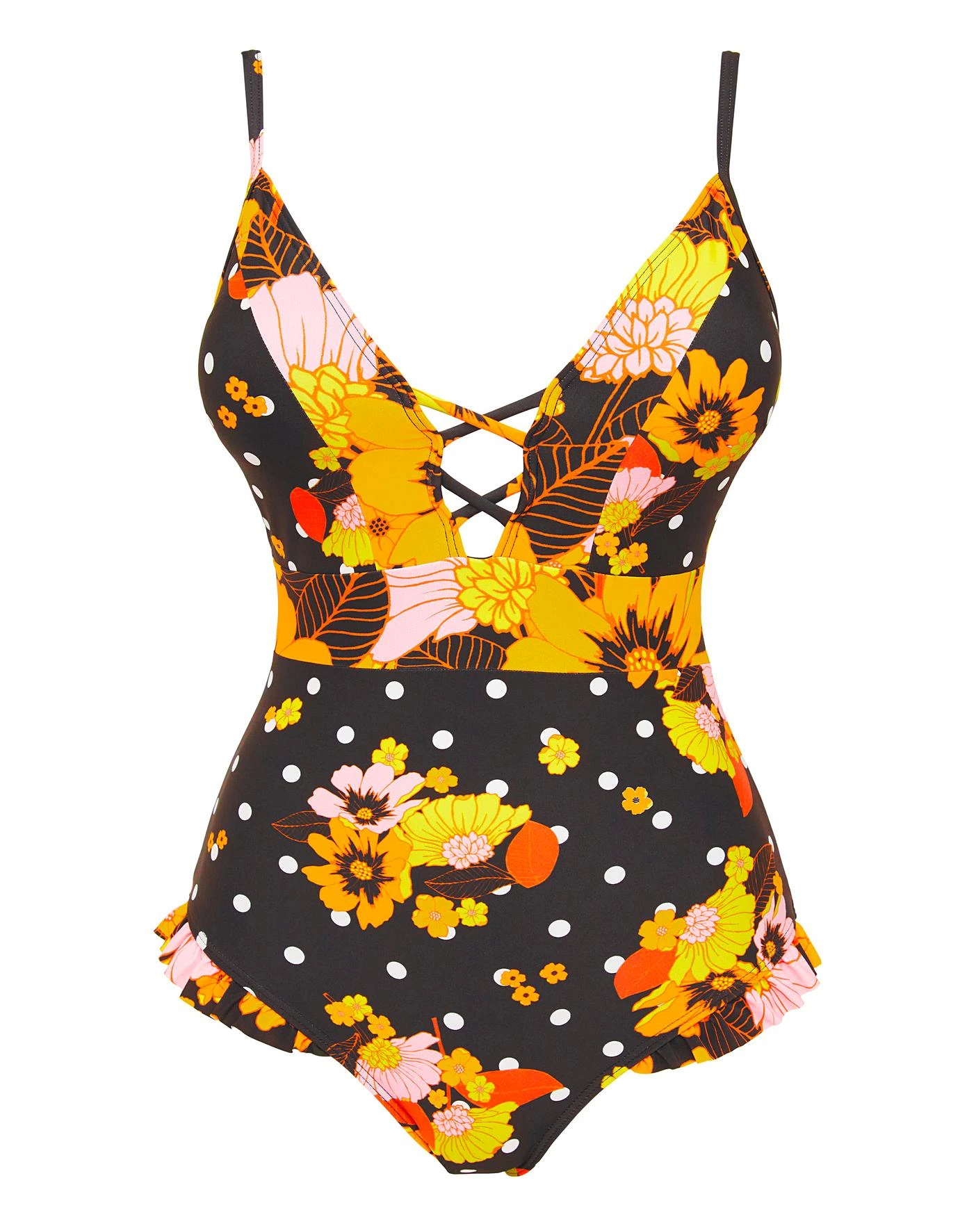 Make a statement with our new retro inspired Joe Browns Swimwear. This swimsuit features adjustable straps and padding for a flattering fit finished with a criss cross front and frill edges for extra style points.