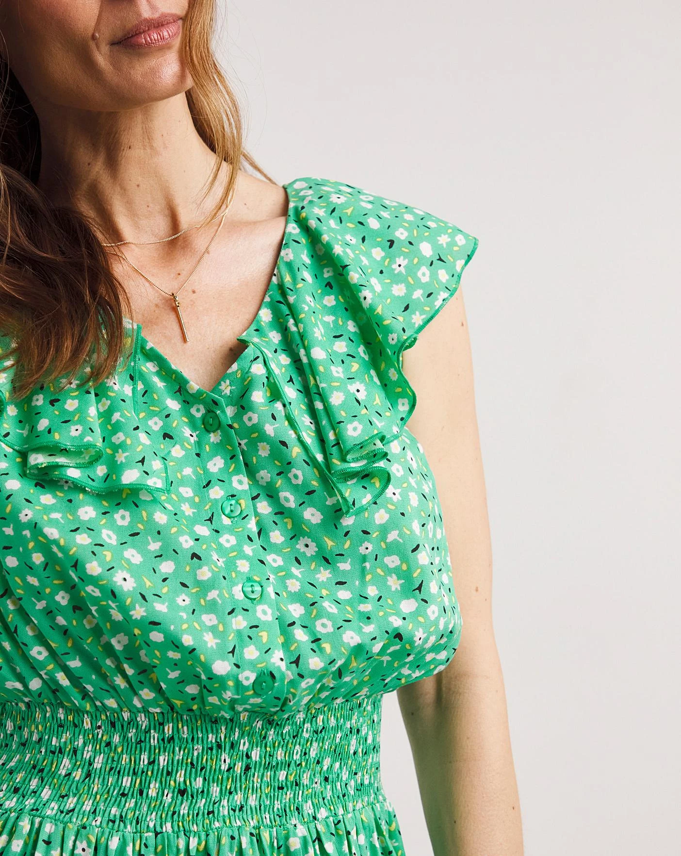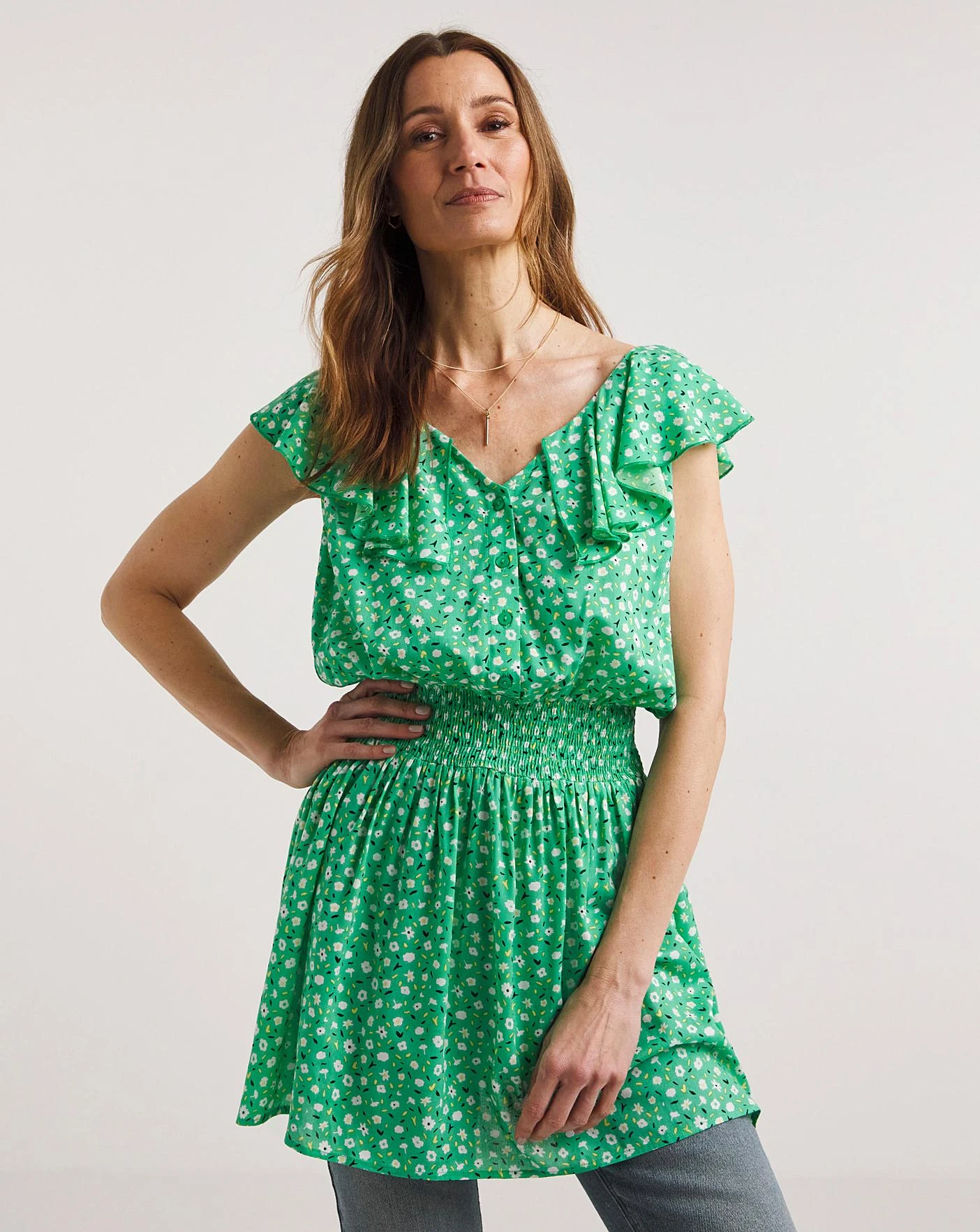 This floral ladies’ top is the perfect partner for your favourite denim. While the stunning print gives us real summery vibes, the pretty frills add a lovely feminine touch that’ll bring a fun, flirty feel to any outfit. This women’s top is a real essential for your seasonal wardrobe!