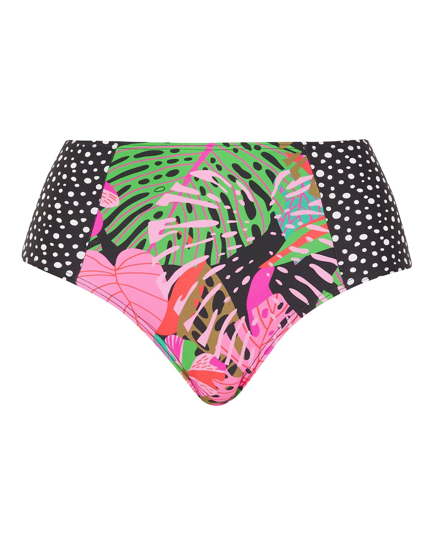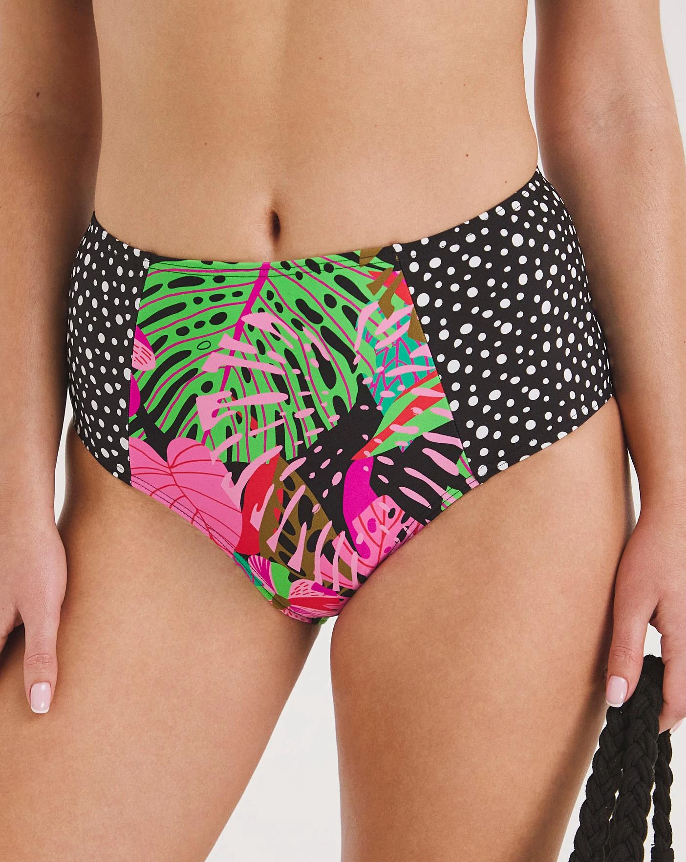 Make a poolside statement with our new season Joe Browns Swimwear. This High waist bikini brief comes in a new bold Jungle Print with contrasting spot printed side panels. For the complete look pair with the matching bikini top.