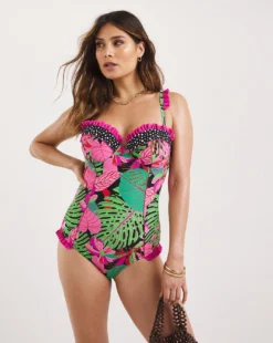 Make a statement with this Joe Browns Swimsuit in a bold jungle print contrasted with a spot print. Finished off with bright pink frill trims and the signature Joe Browns Charm this style features wired cups and adjustable straps to ensure the most flattering fit.