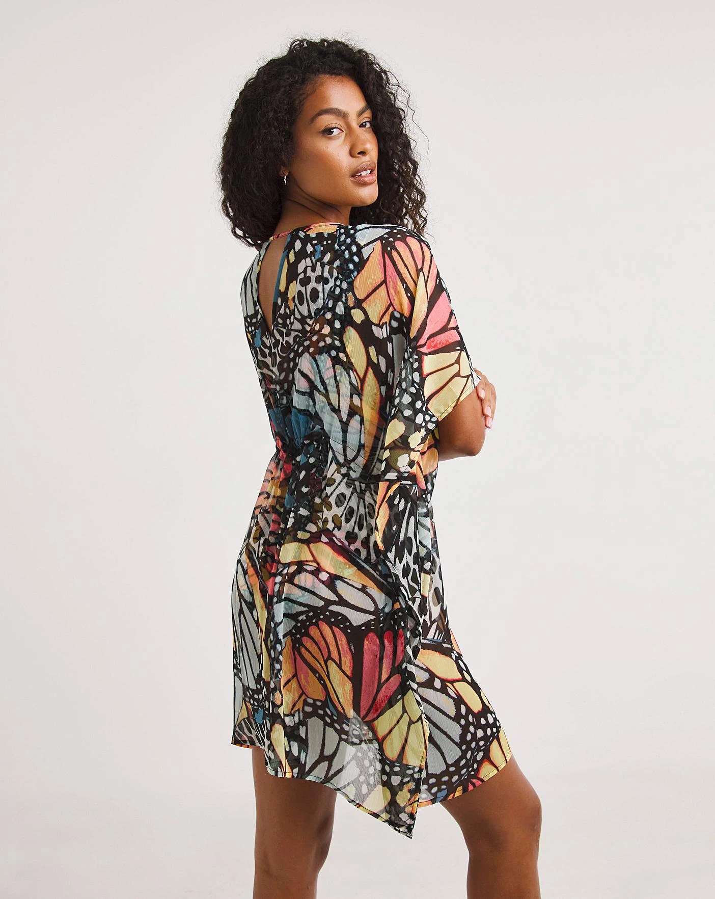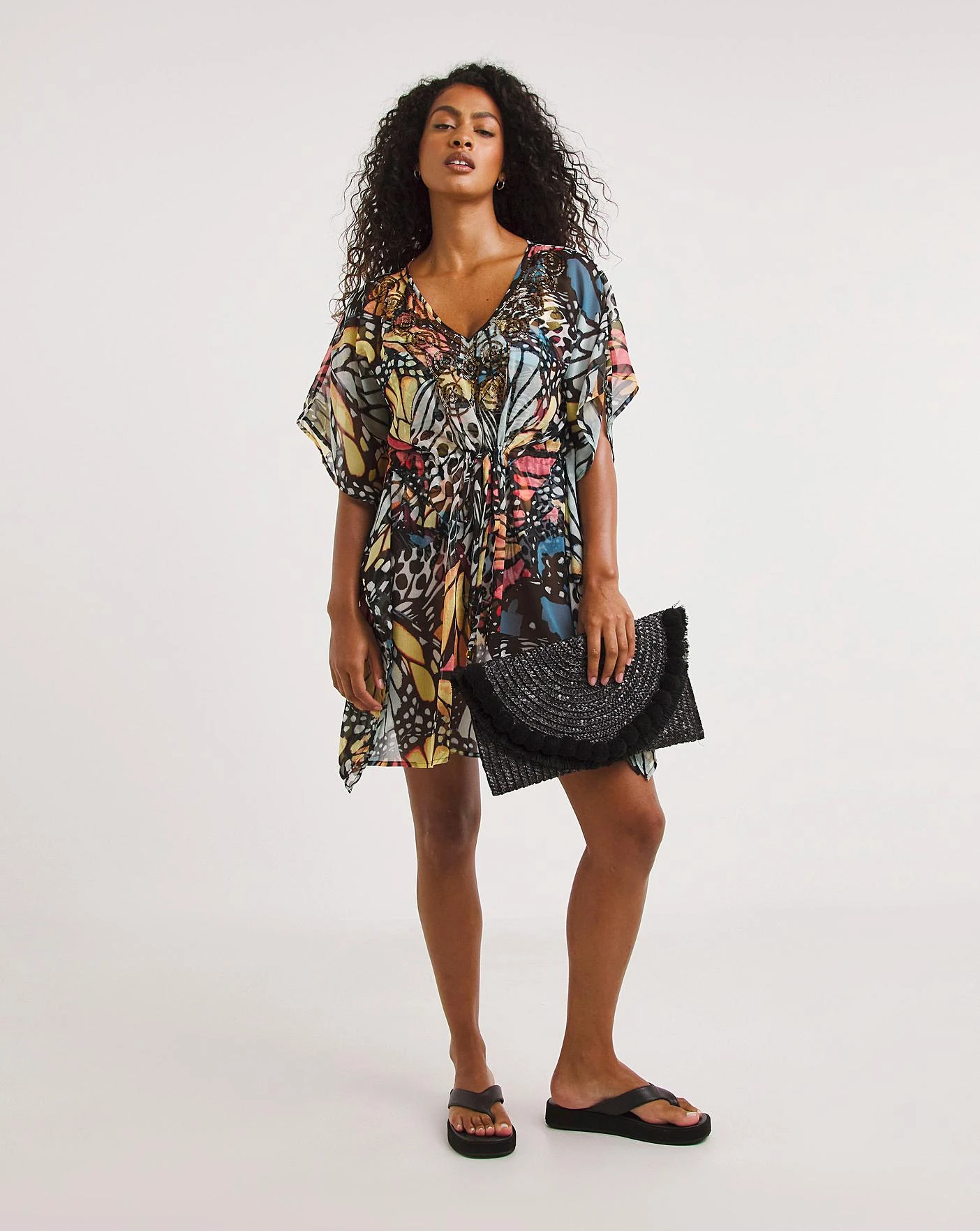 The perfect beach cover-up this summer! This Butterfly print kaftan features a tie waist and embellishments to add a little sparkle to your next holiday. Pair with our matching swimwear for the ultimate beach look.