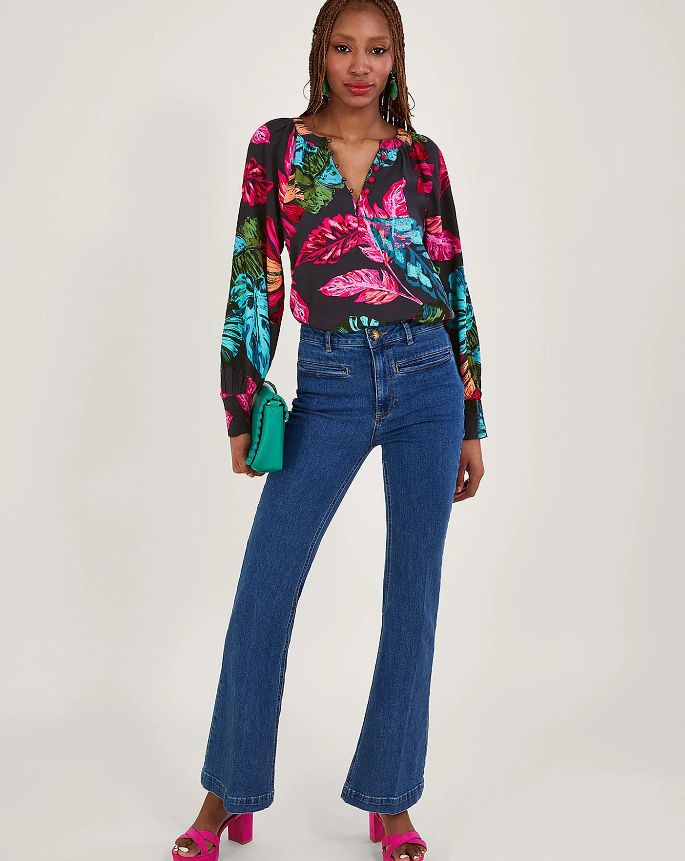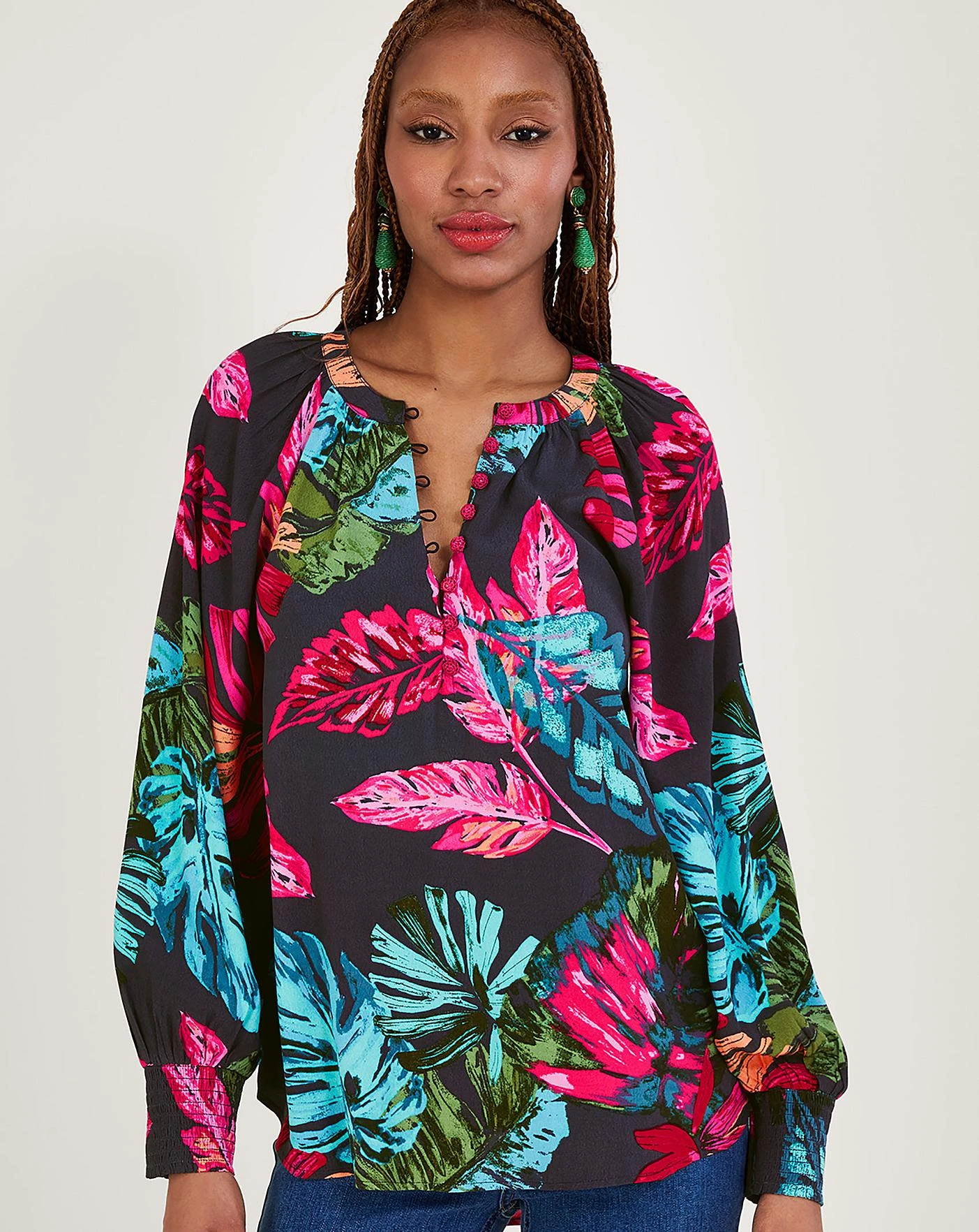 - Bursting with fuchsia and aqua hues, Bria is ready to dance her way through the summer months. She’s cut in a loose silhouette, with shirred cuffs to the sleeves and an open neckline. As part of the journey to make our clothes kinder to the world around us, this item was made using more sustainable raw materials, such as organic cotton, recycled polyester and viscose from responsibly grown forests.