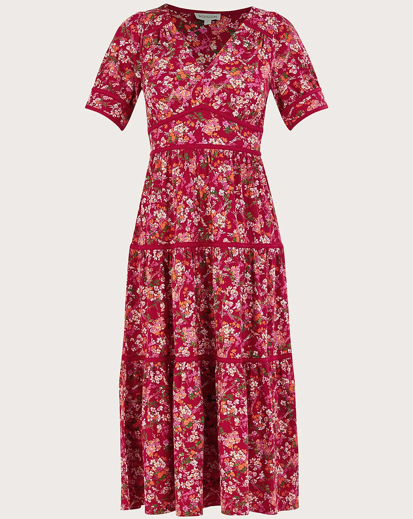 - A truly romantic piece to style to dinners, this dress is built on a rosy-rouge palette with ditsy florals running throughout. Highlighting the bust, waistline and tiered skirt, follow the jersey piping through the midi length. Finished with a v-neck and puff sleeves, style it with strappy heels in the evening or sandals under the sun.As part of the journey to make our clothes kinder to the world around us, this item was made using more sustainable raw materials, such as organic cotton, recycled polyester and viscose from responsibly grown forests.