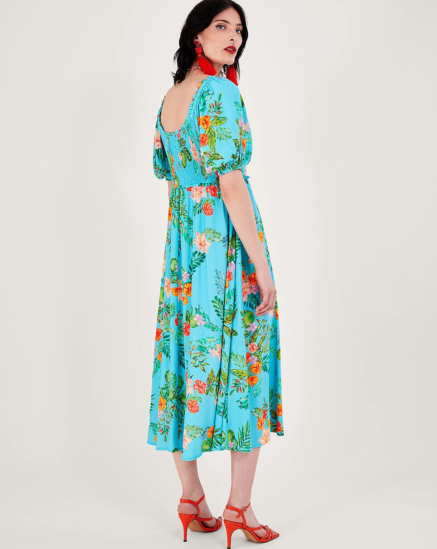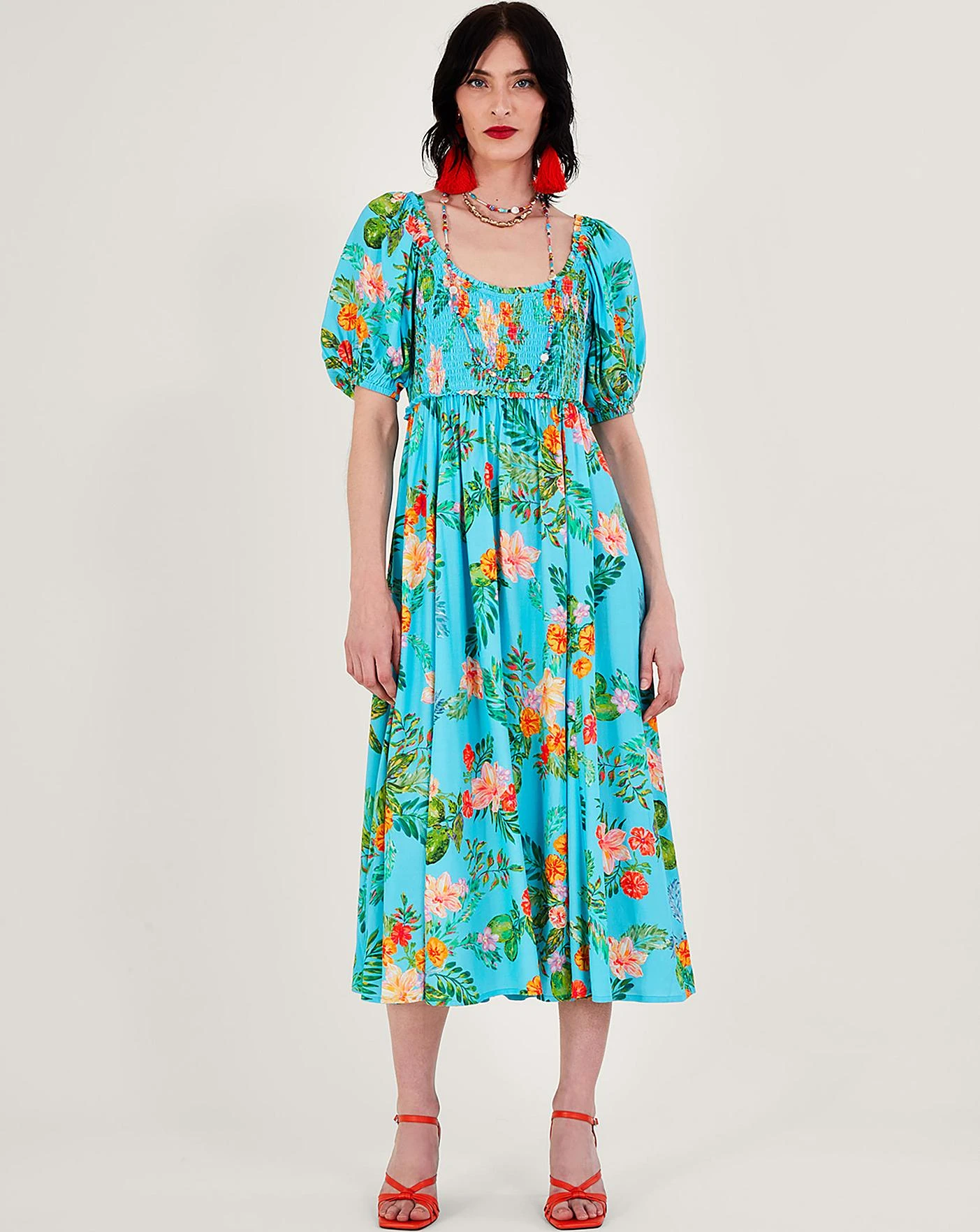 - Taking you to the tropics, our Limella dress showcases a blue backdrop that’s overrun by vibrant florals and foliage. Wonderfully feminine, the shirred bodice combines puff sleeves with a scoop neckline, whilst the skirt falls to midi length. Accessorise with colour to continue the uplifting design. As part of the journey to make our clothes kinder to the world around us, this item was made using more sustainable raw materials, such as organic cotton, recycled polyester and viscose from responsibly grown forests.