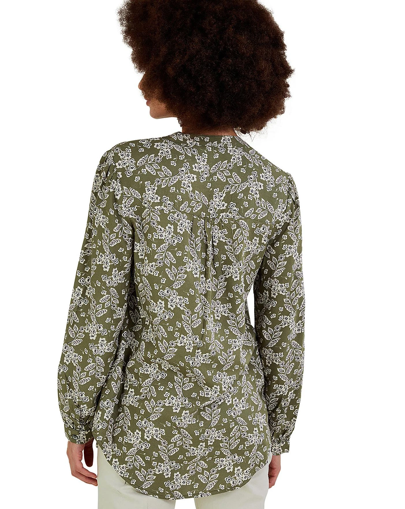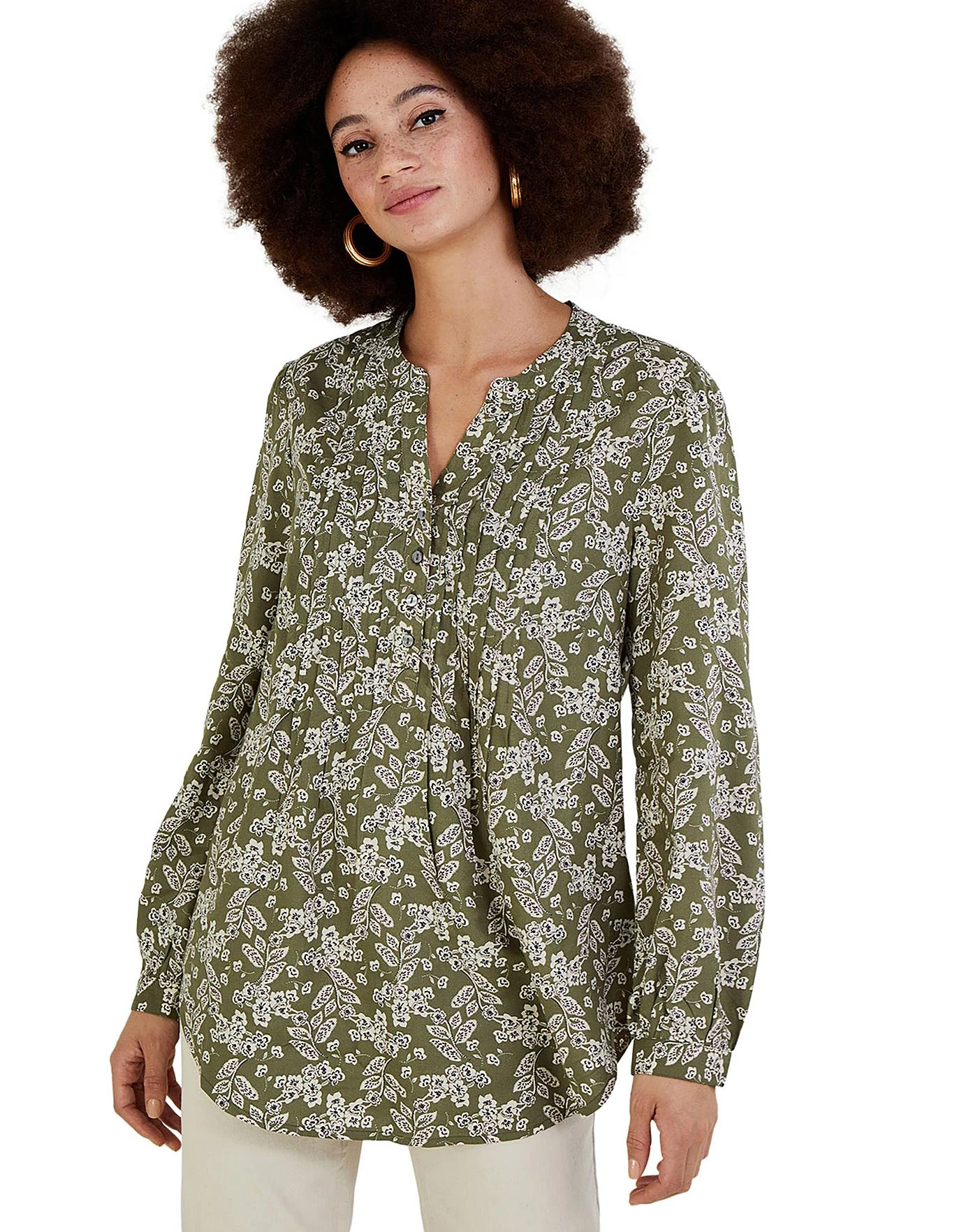- Douse yourself in earthy tones and breathe a little life into your office edit with this blouse. It’s cut in a relaxed, longline fit for the warmer months, with pleating to the front and a button through fastening that ends mid-way down the bodice. The collarless finish ensures a more casual approach, pairing perfectly with tailored trousers. LENZING ECOVERO is a sustainable fabric derived from certified renewable wood sources and made using eco-responsible production methods. It generates up to 50% lower emissions and water impact than traditional viscose, contributing to a cleaner environment. As part of the journey to make our clothes kinder to the world around us, this item was made using more sustainable raw materials, such as organic cotton, recycled polyester and viscose from responsibly grown forests.