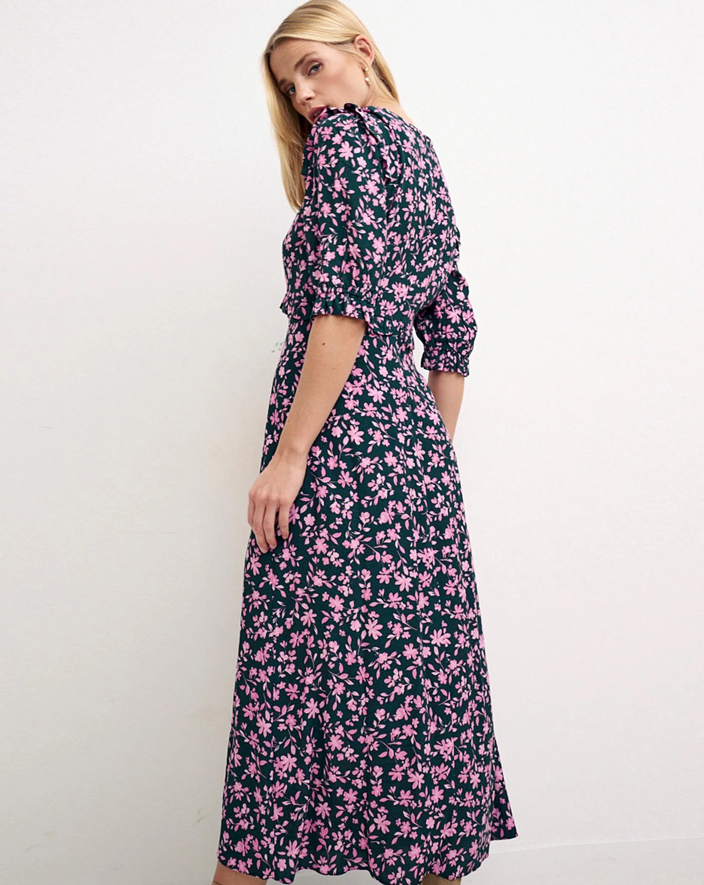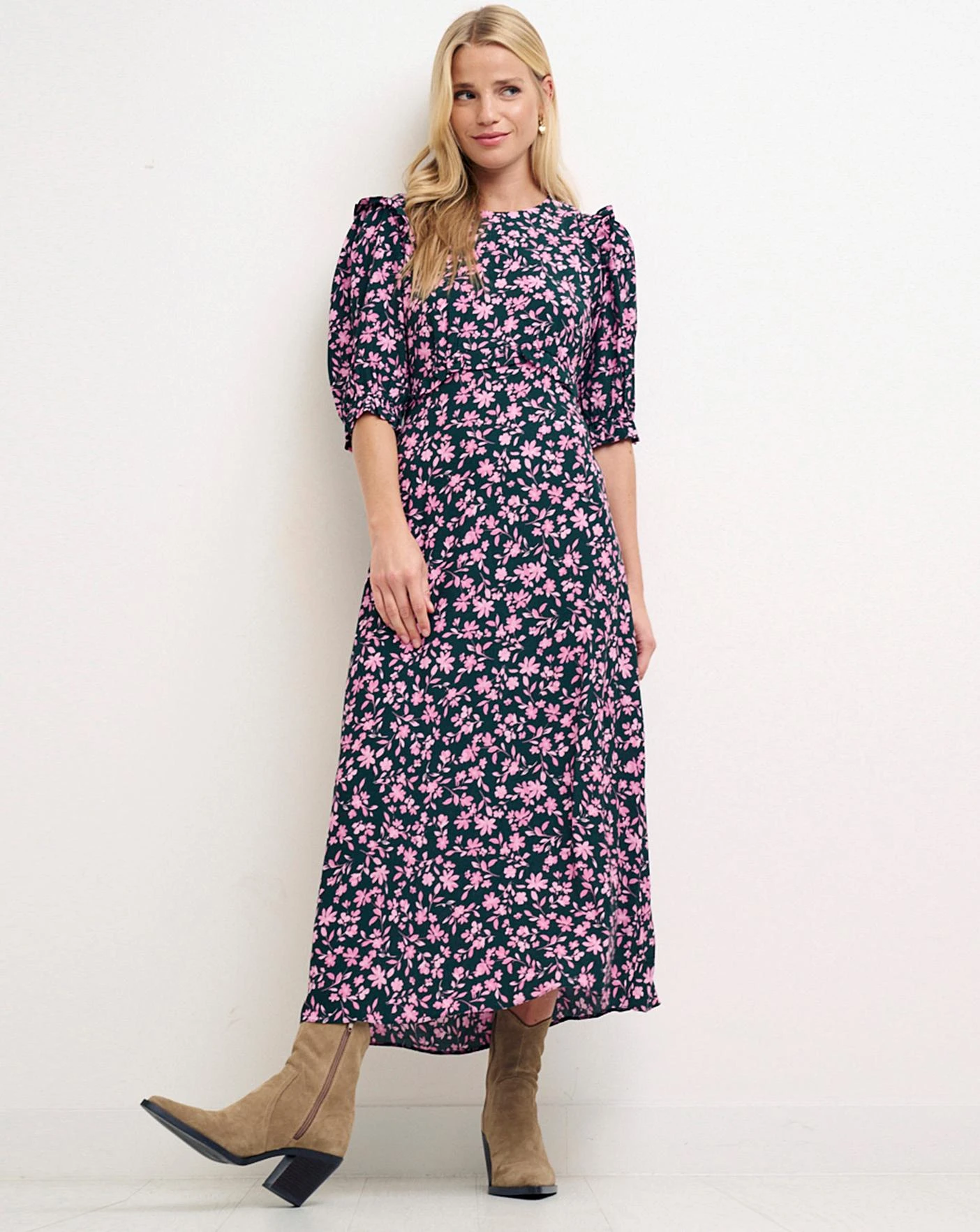 Another felicia dress for your collection, with it’s soft shape skimming fit refreshed in bold pink florals. It’s made from eco conscious fabric and outlined with subtle ruffles and gathered sleeves. Pair the midi length with heels or flats.
