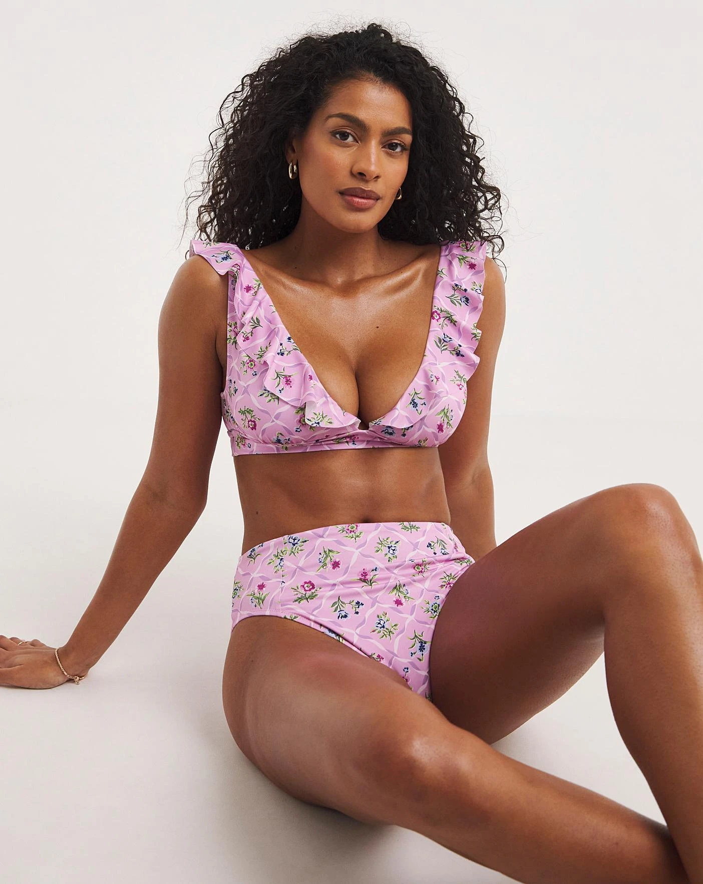 Inspired by vintage swimwear, our Gloria bikini top in a purple bse with floral print. Crafted from a responsible fabric blend made from recycled plastic bottles, complete with a touch of stretch. Stylish details include frill neckline and a back tie, designed to knot elegantly before falling down your back. Just add the matching bottoms and your sunglasses. Triangle padded cups, pads removable. Underbust gathers. Self-tie back. Lined.