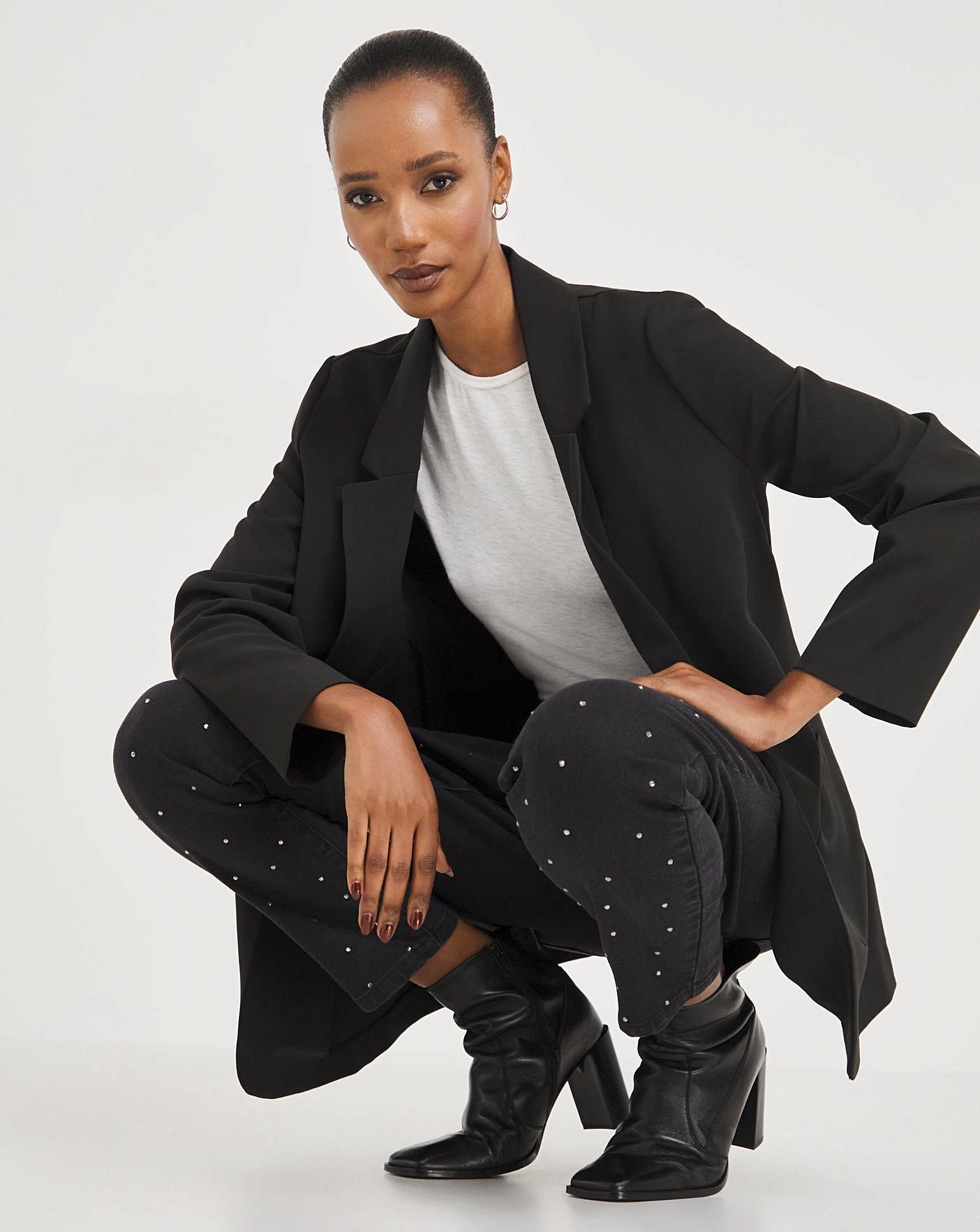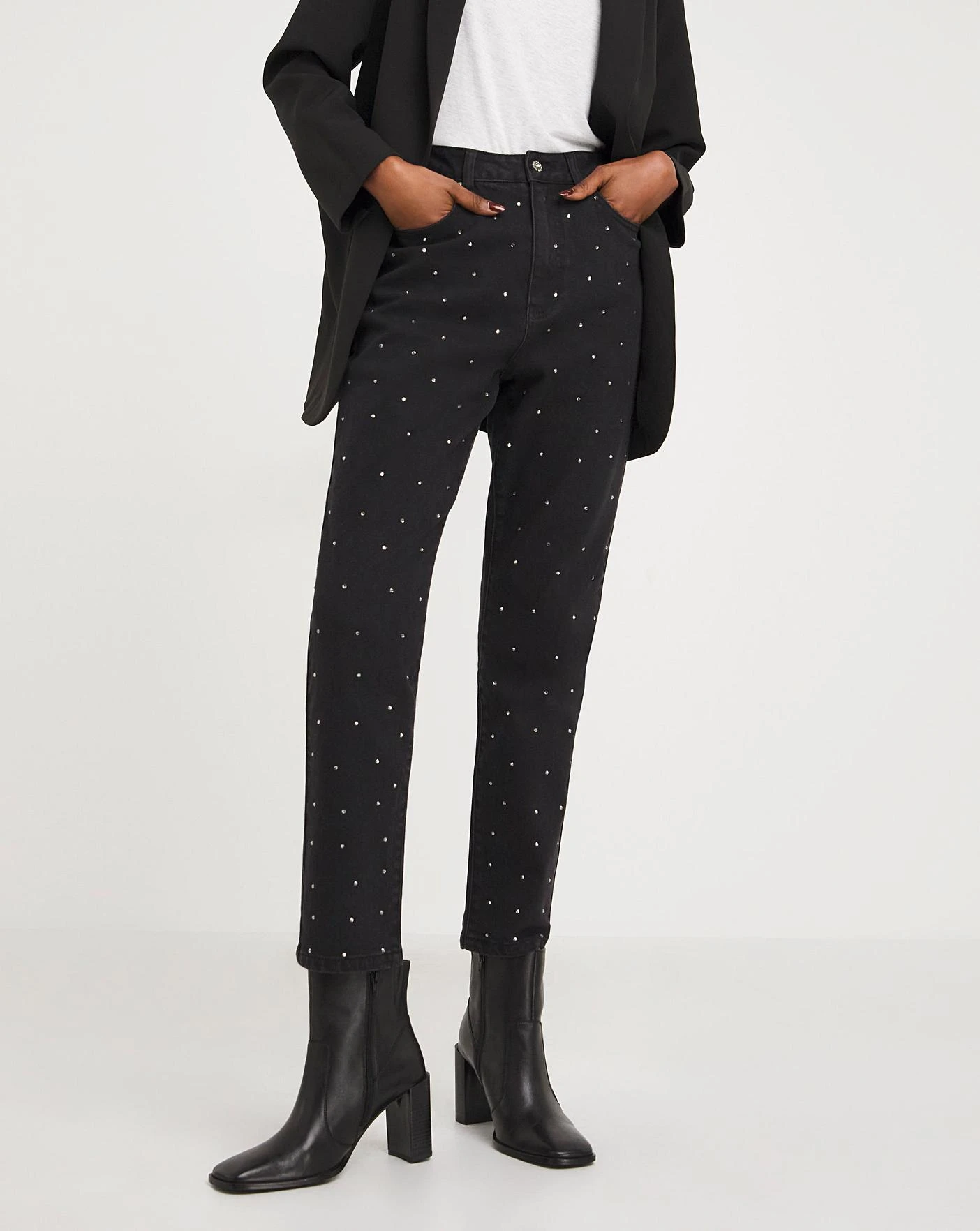 Our new scattered diamante slim jeans are the perfect addition to your party wardrobe. Made from a comfy, stretch denim fabric, these jeans will not only keep you super stylish but also comfortable all night long. In a relaxed, slim leg shape, these jeans feature scattered diamante embellishment up each front leg panels, with pocket detailing.