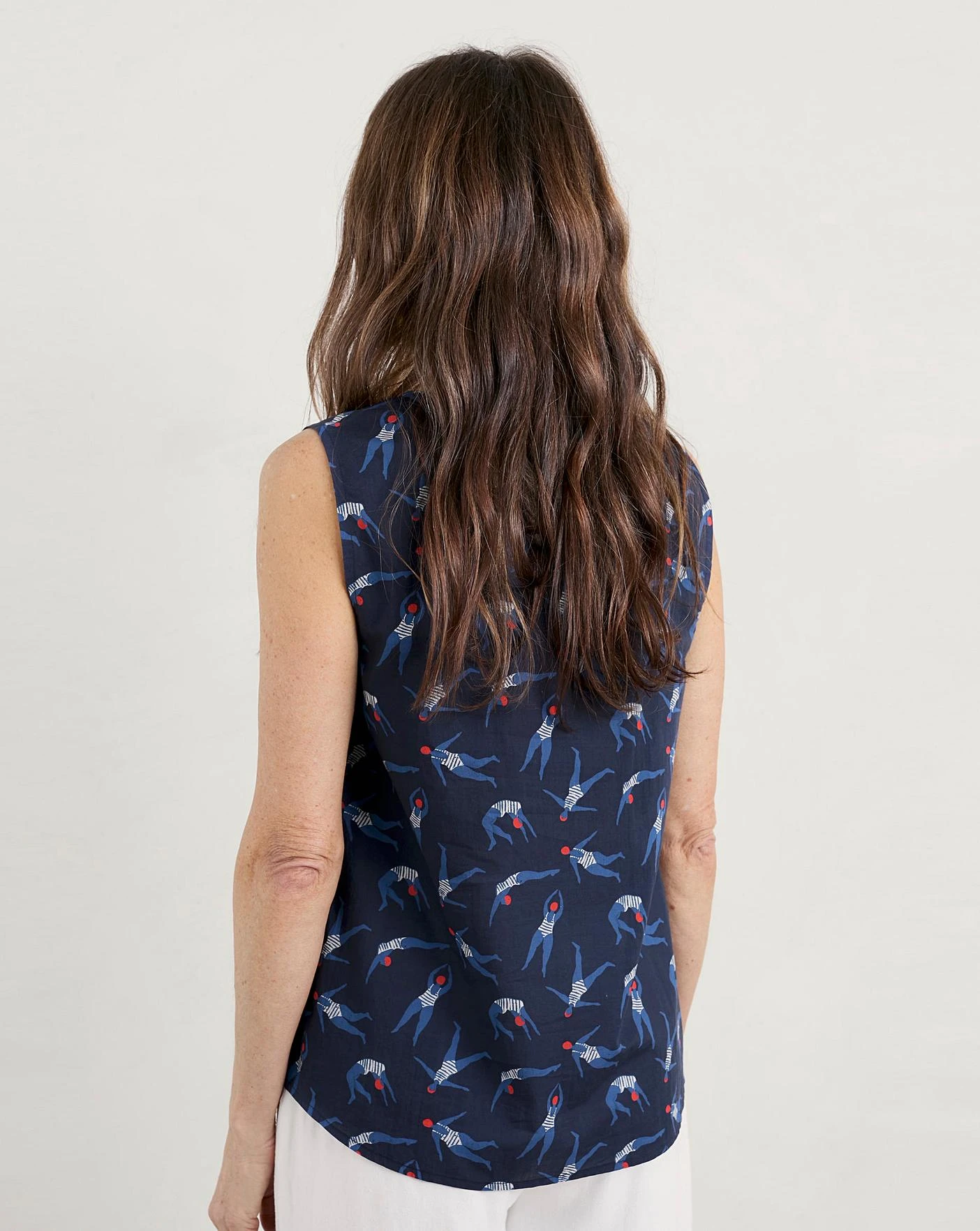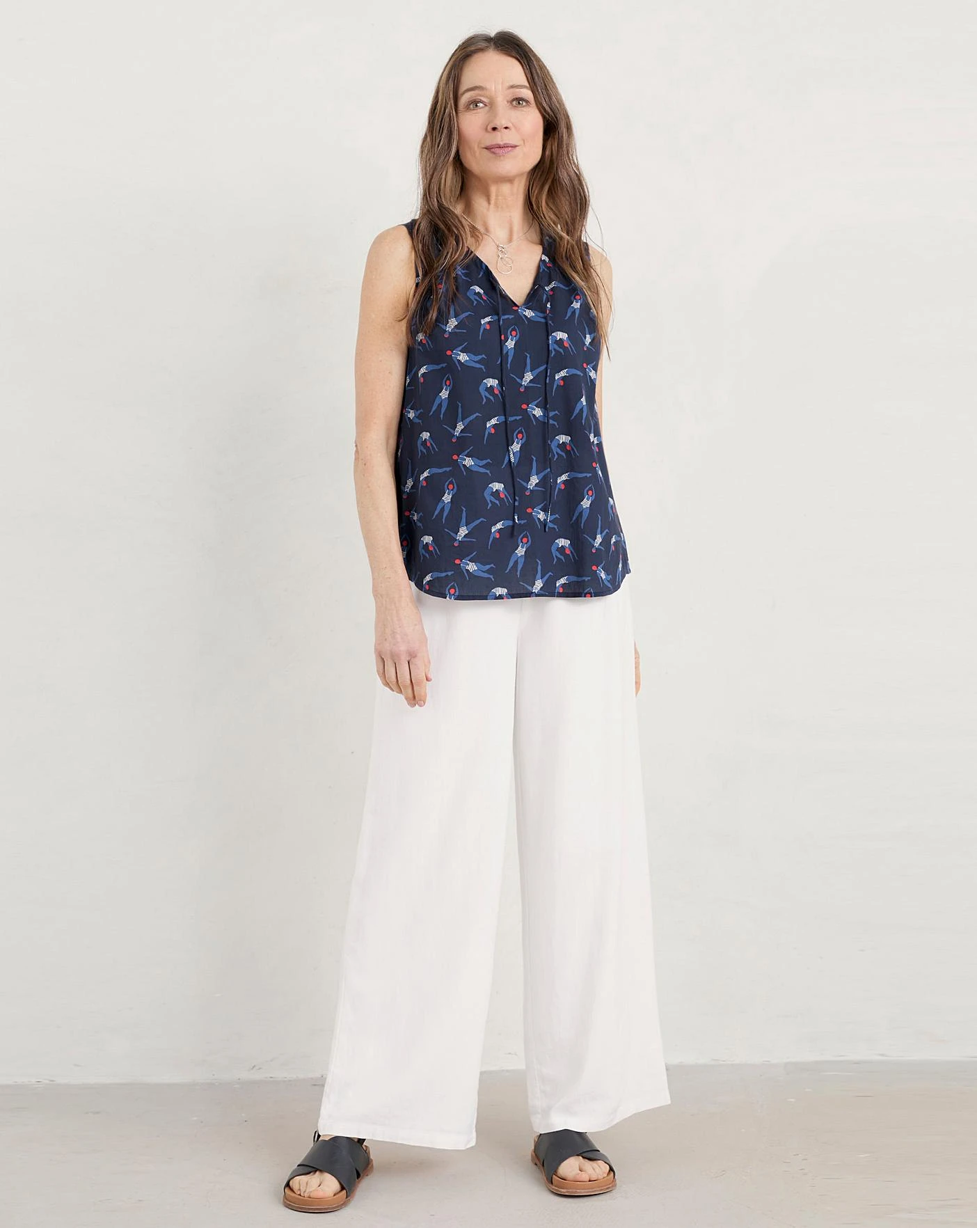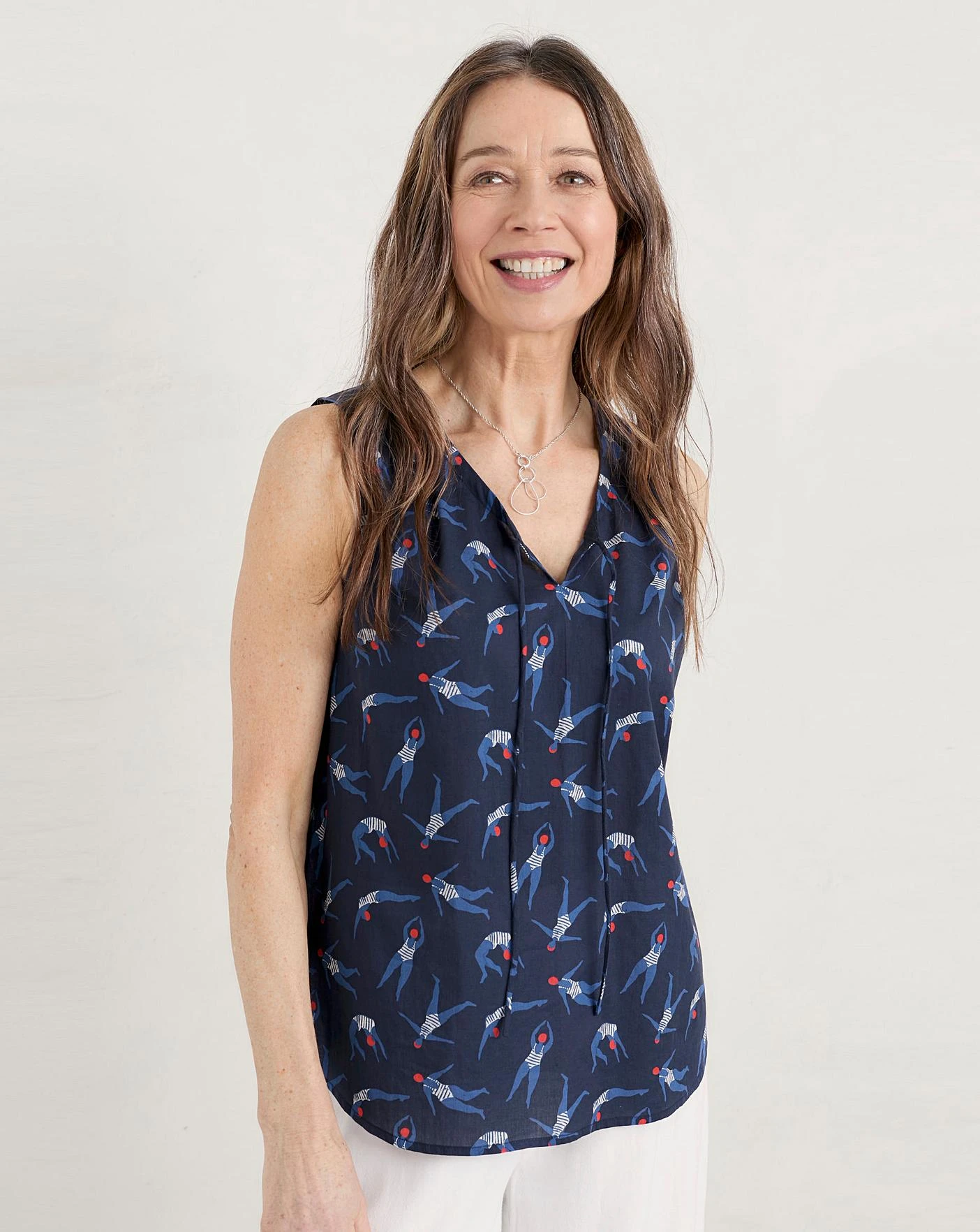 Cool and easy sleeveless printed summer top. The V neck has a keyhole detail with fine rouleau ties.