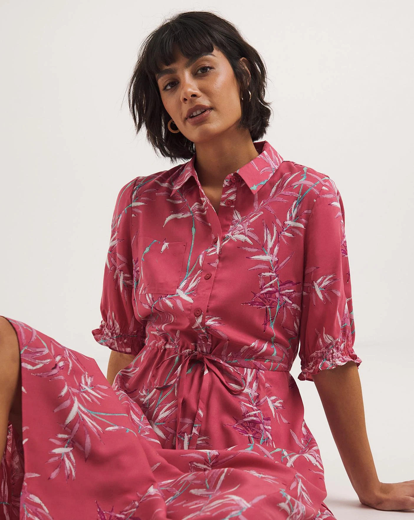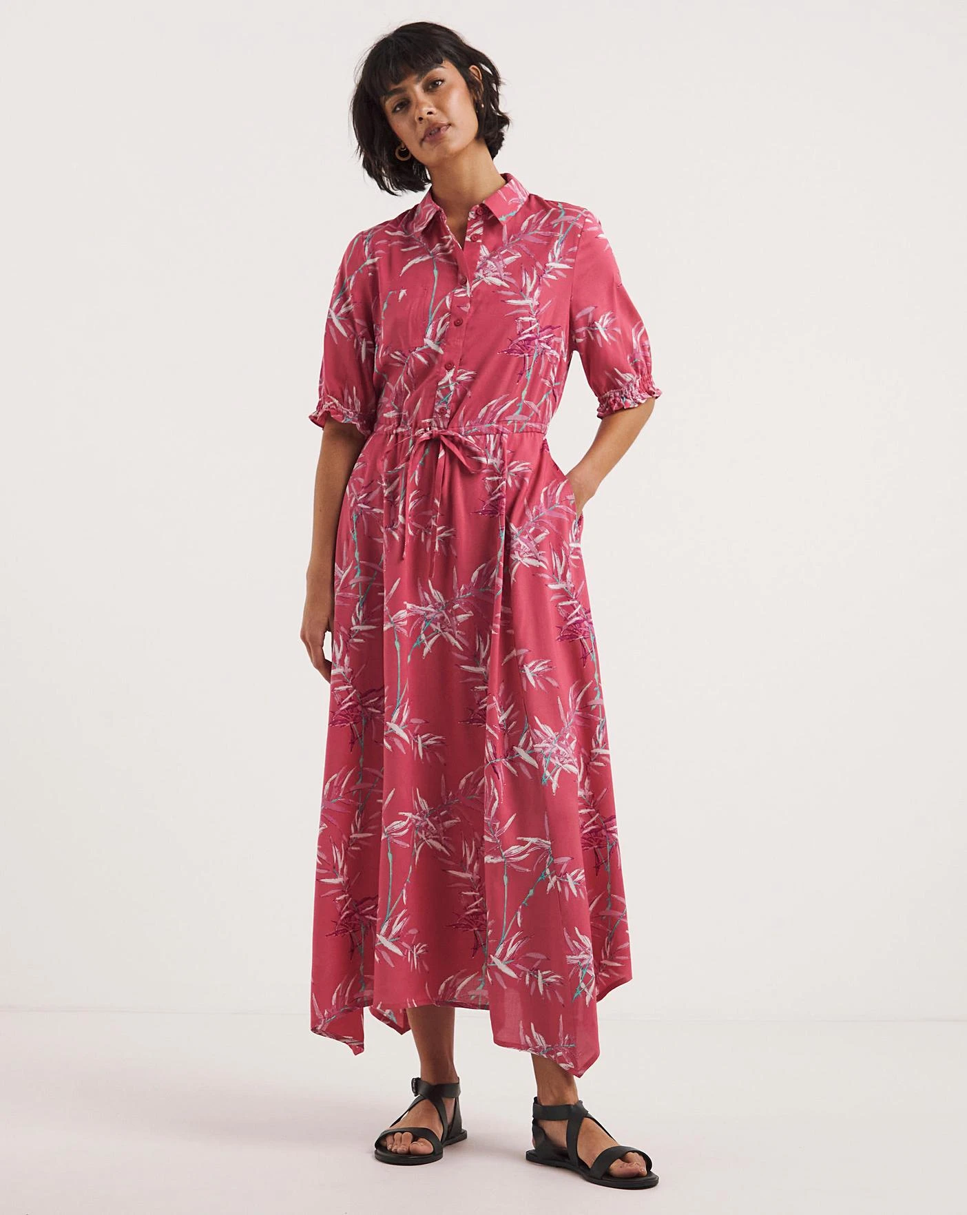 Perfect for this summer. The pretty asymmetric hem shirt dress features a flattering drawstring waist, short voluminous sleeves and collar detail. In a floral print, this midi dress is deigned with an asymmetric hem.